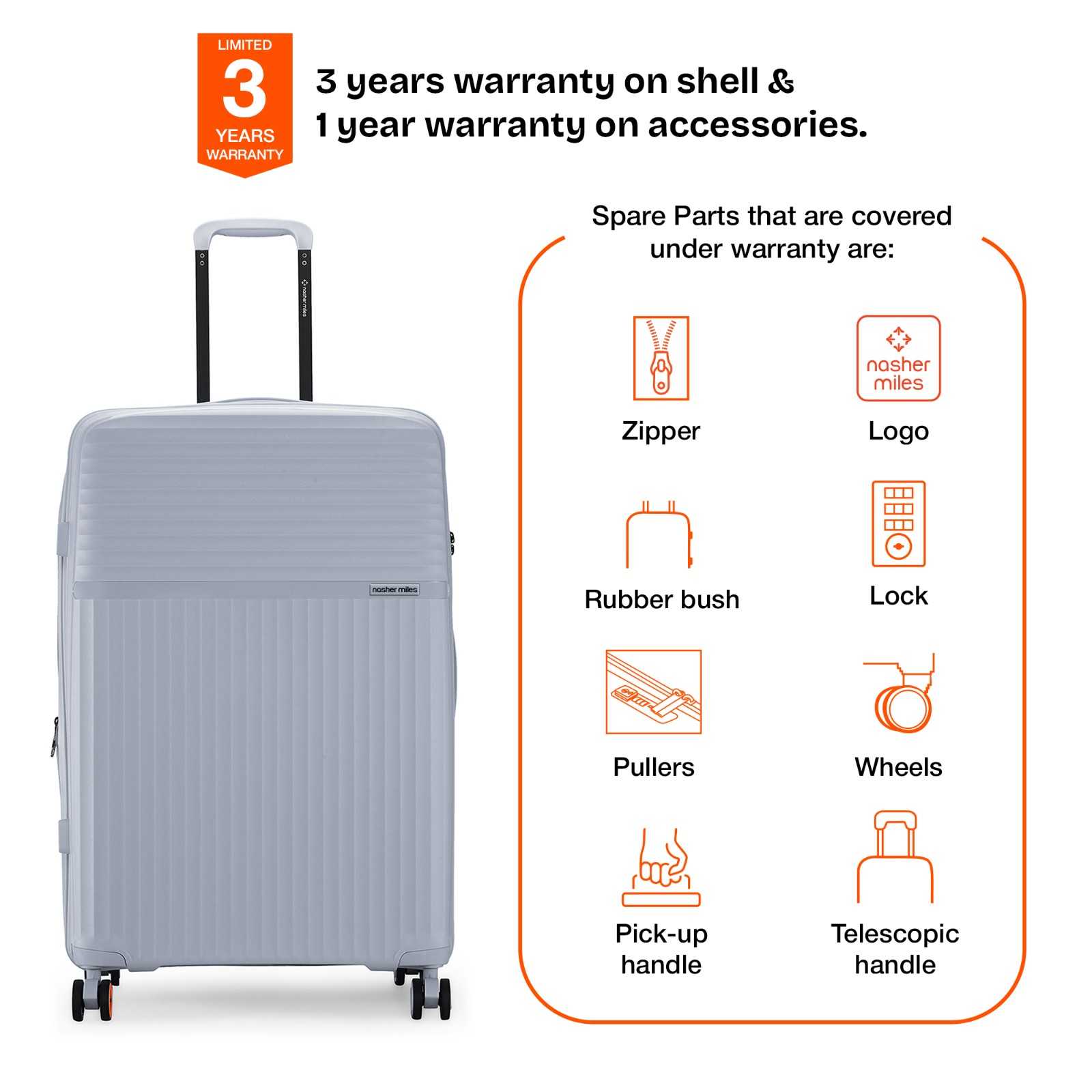 Warranty: 3 Years warranty on shell & 1 year warranty on accessories. Wear & Tear for product under use and scratches are not covered.