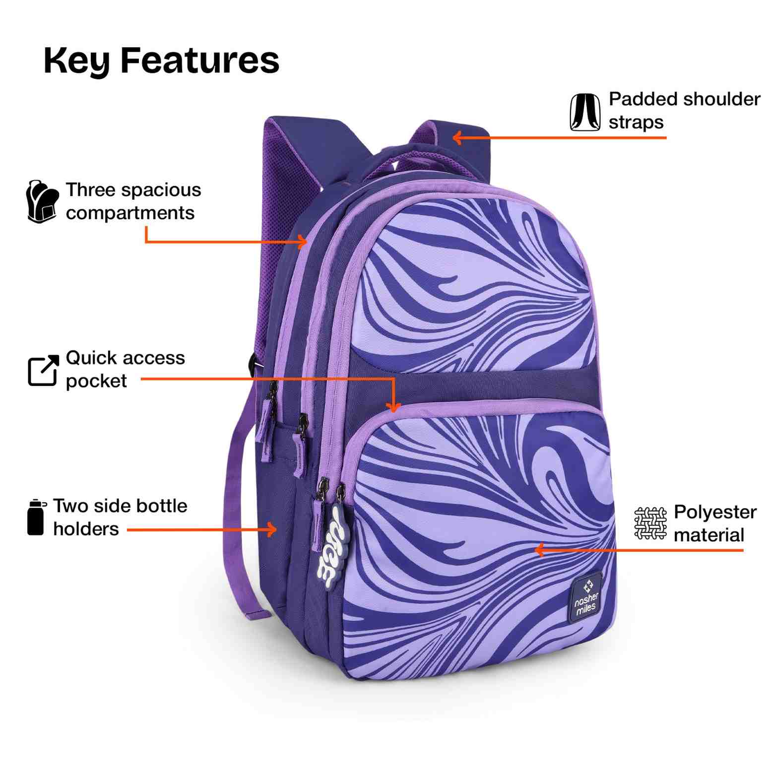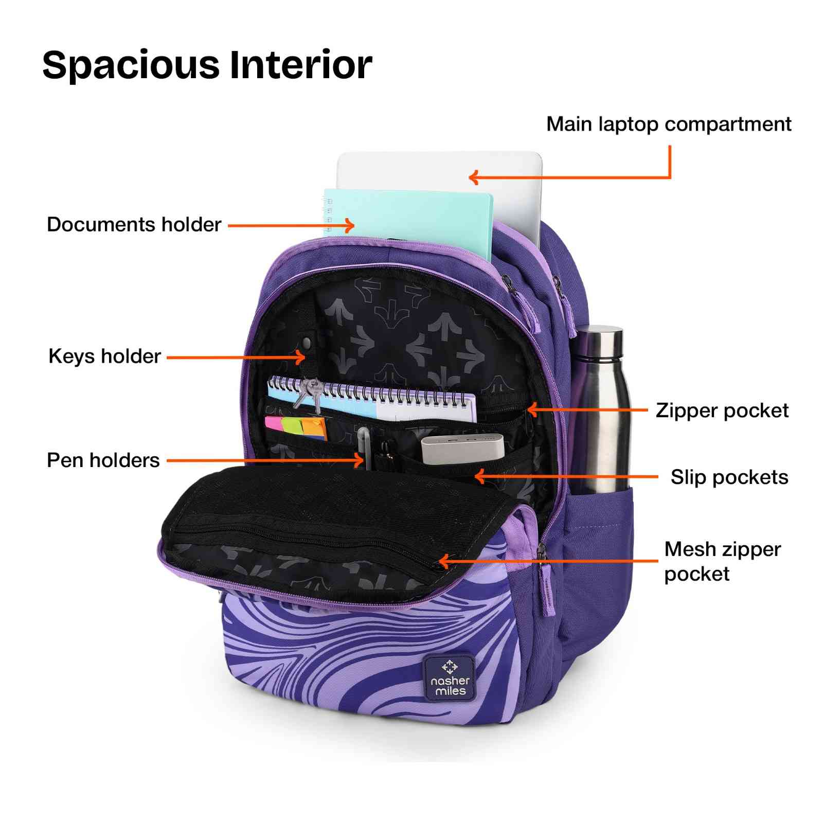Structured Storage Layout: This backpack features a front zipper quick-access compartment for daily essentials. The first compartment provides dual-side organization with a mesh zipper pocket & slip pockets on one side, and a zipper pocket, slip pockets, and pen holders on the other. The spacious main compartment fits books and documents, while the third compartment includes a dedicated laptop section with a zipper pocket. Two outside bottle pockets add extra convenience.