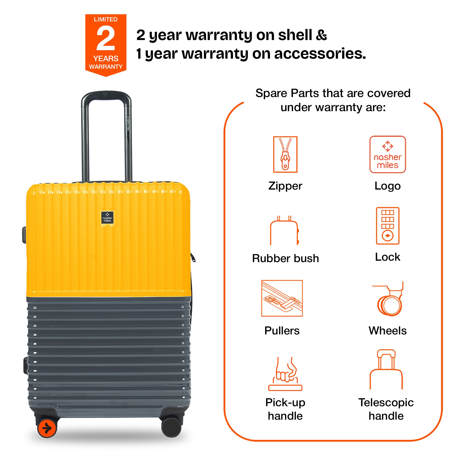 2 Years warranty on shell & 1 year warranty on accessories.Wear & Tear for product under use and scratches are not covered.