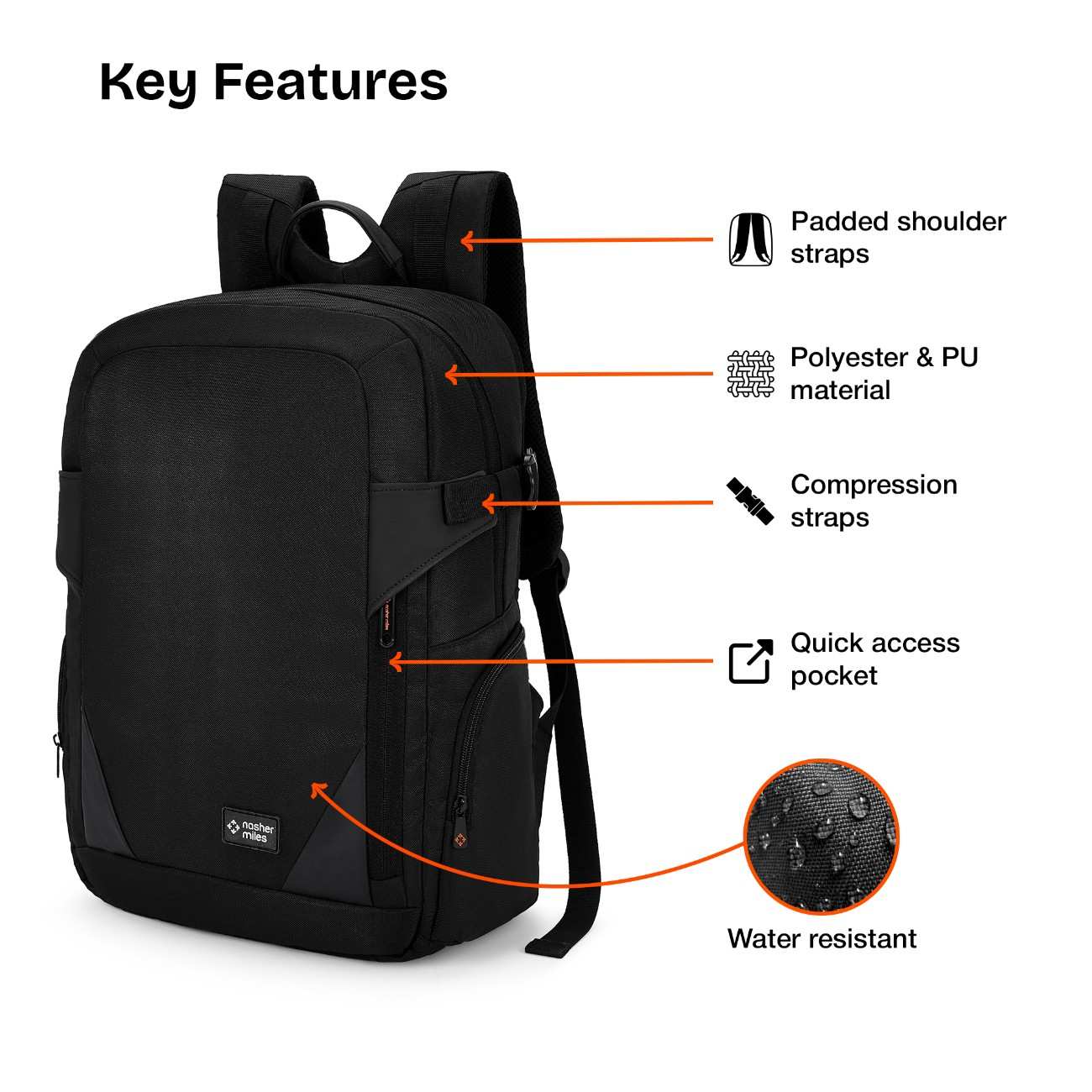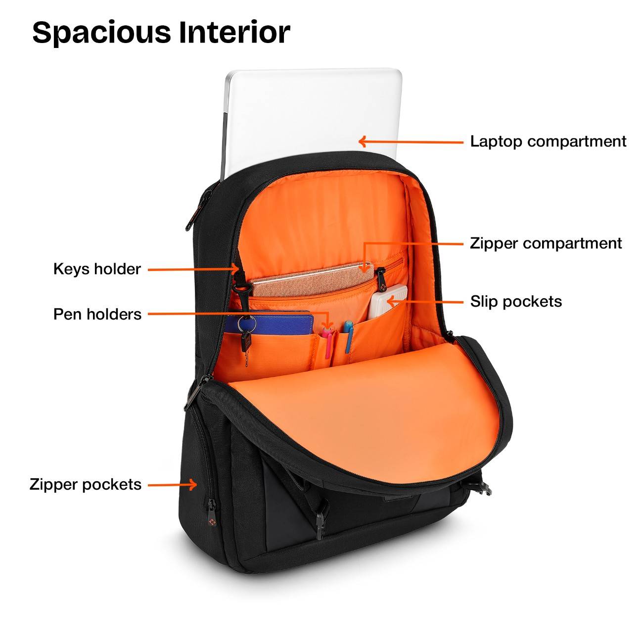 Organized Interior Design: Crafted with a well-planned interior layout, this backpack features a front zipper quick-access compartment for everyday essentials. The two-compartment design includes a first compartment with an organizer pocket featuring a zipper pocket, two slip pockets, pen holders, and a dedicated key holder. The second compartment houses a secure laptop compartment, while two side pockets provide additional storage for daily accessories.