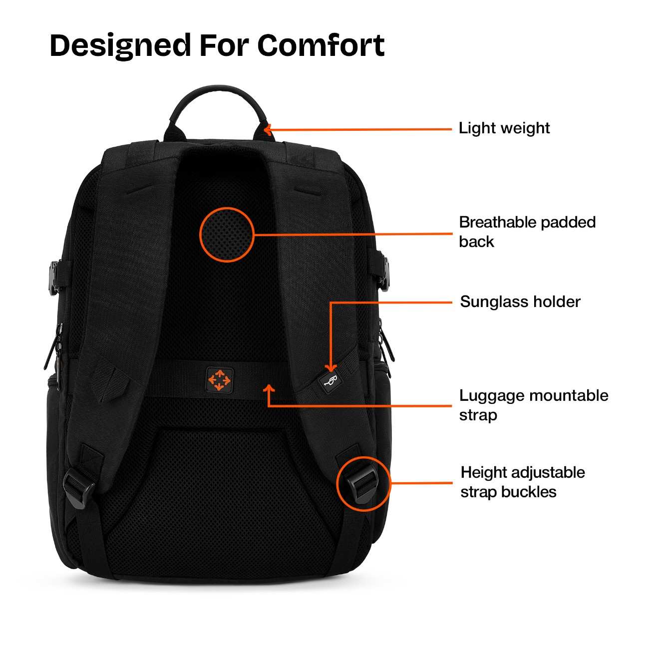 Ergonomic & Travel-Ready Design: Designed for everyday comfort, this backpack features padded shoulder straps and a cushioned back panel to reduce strain during extended wear. The luggage-mountable strap allows easy attachment to trolley handles for hands-free travel, while the sunglasses holder ensures quick access. Compression straps on both sides help balance the load and maintain a sleek shape.