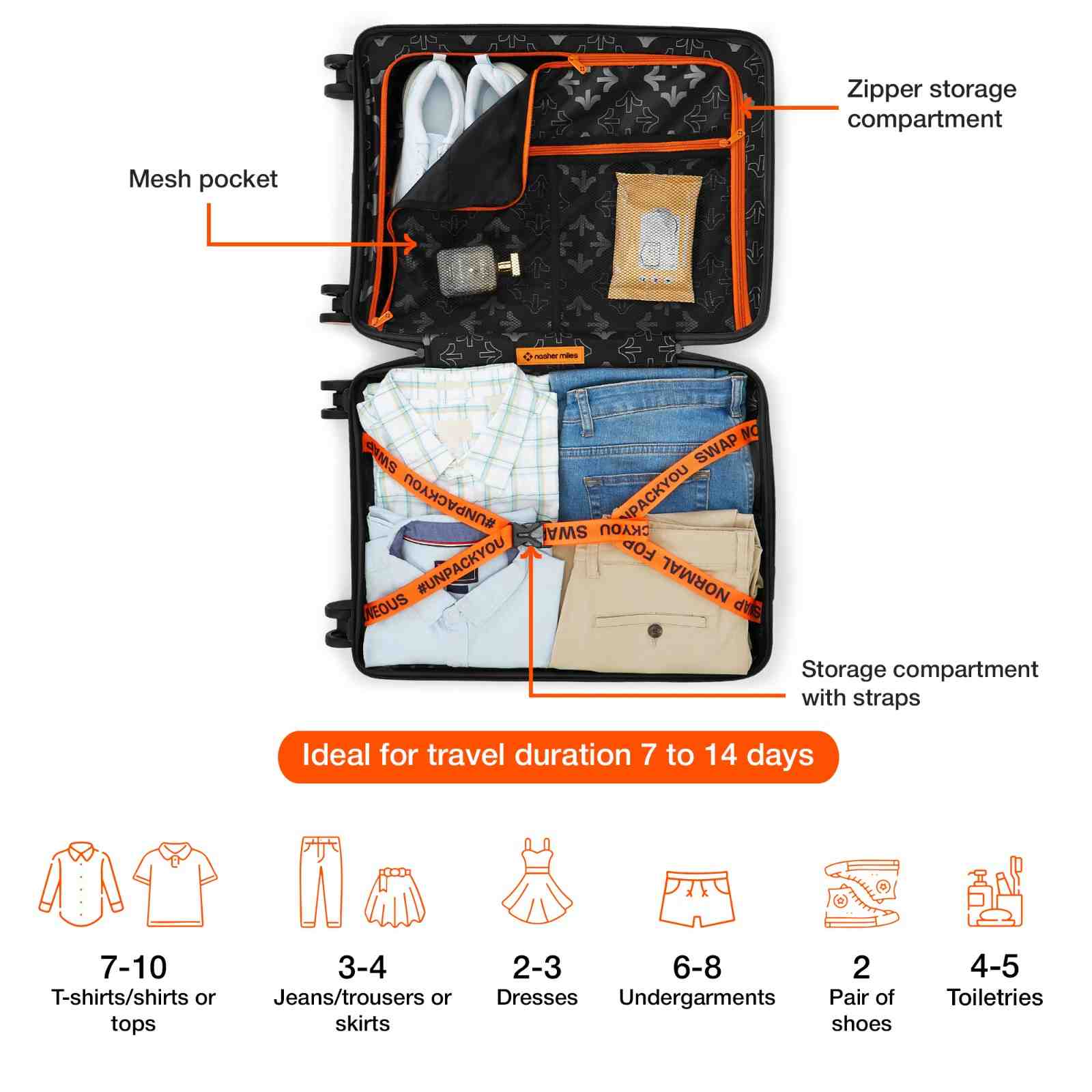 Check-In Medium (M): With a 24-inch size, this check-in suitcase is ideal for travel duration ranging from 5-7 days, making it the perfect companion for weekend getaways, business trips, or vacations. Suitcase can hold weight up to 15 Kg.