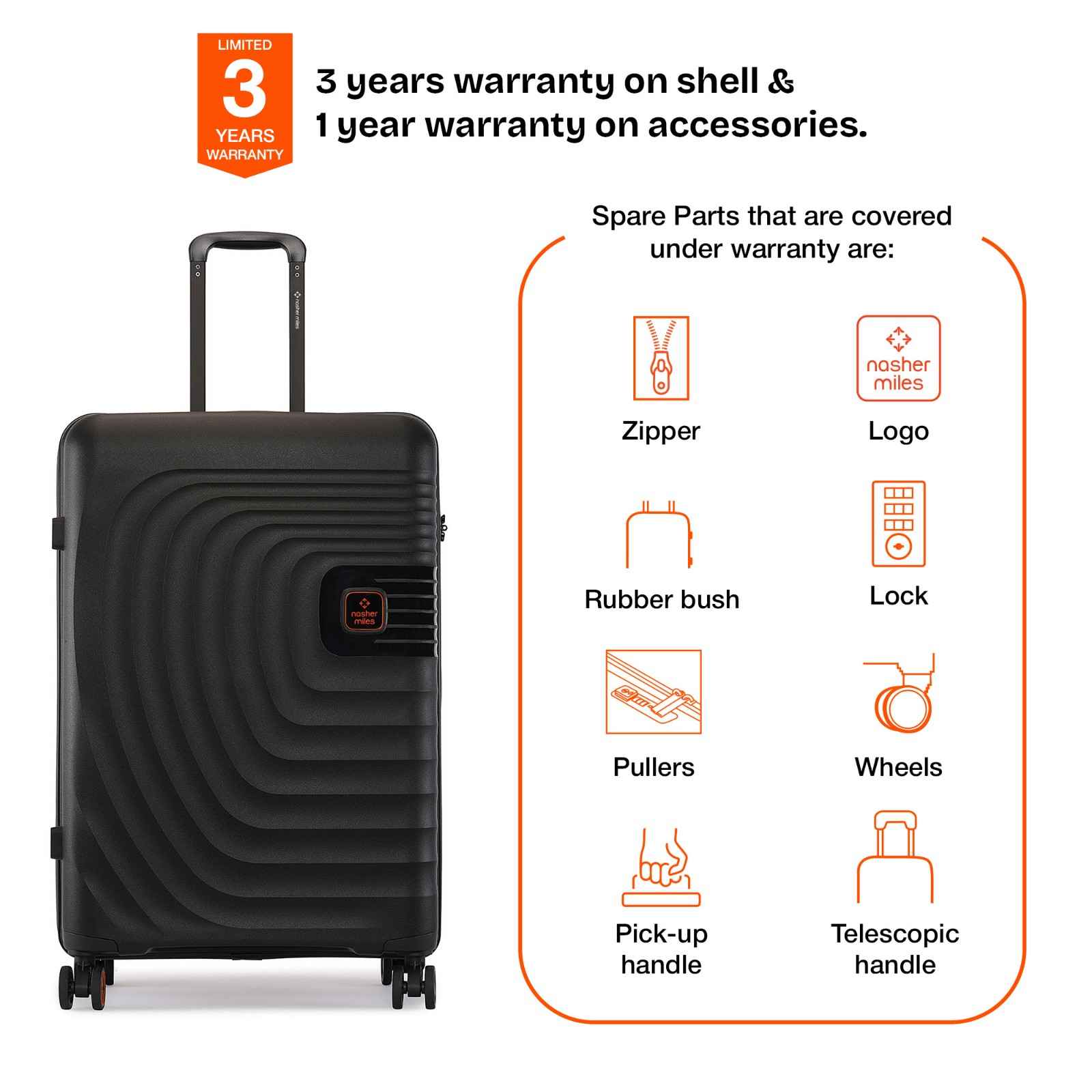 Warranty: 3 Years warranty on shell & 1 year warranty on accessories. Wear & tear for product under use and scratches are not covered.