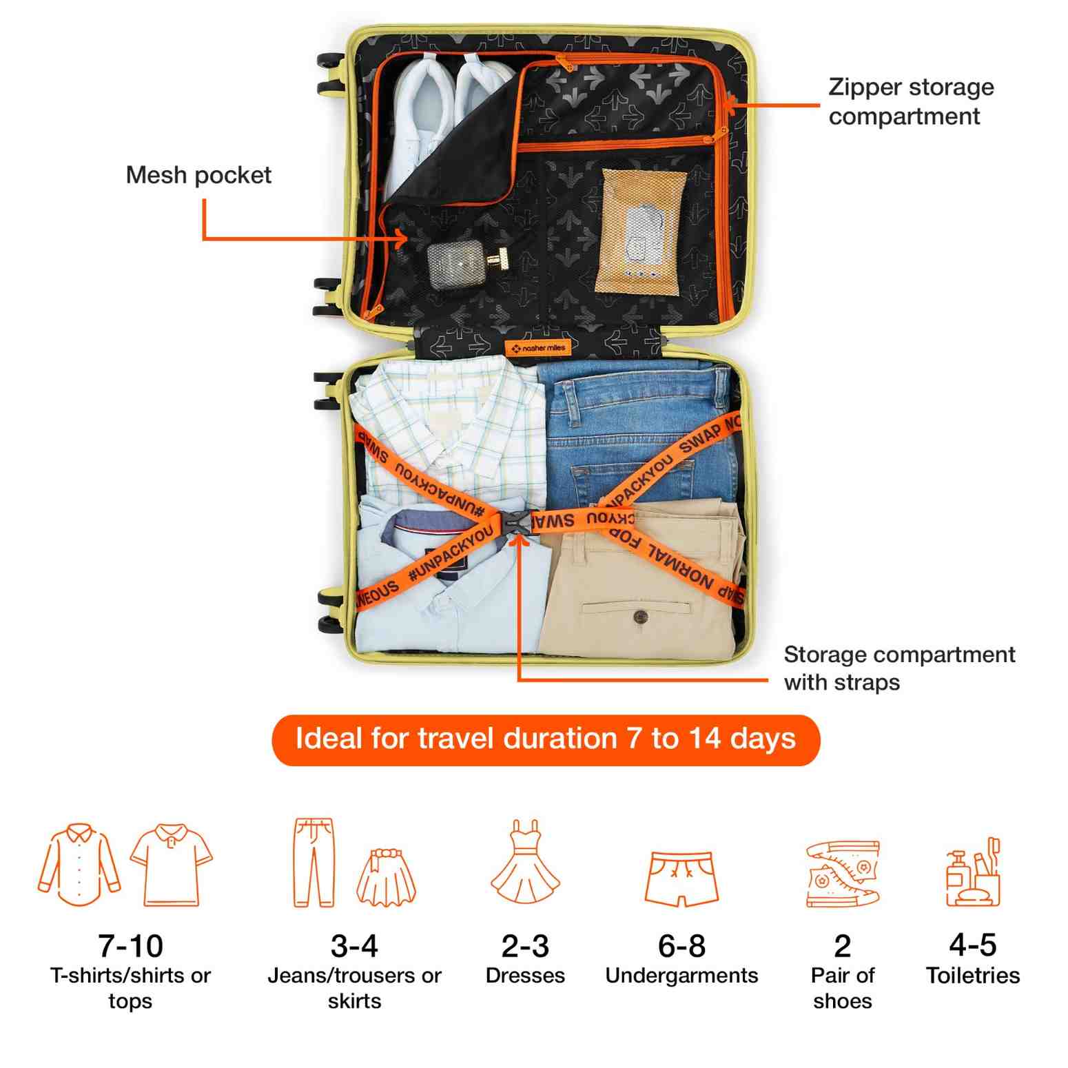 Check-In Medium (M): With a 24-inch size, this check-in suitcase is ideal for travel duration ranging from 5-7 days, making it the perfect companion for weekend getaways, business trips, or vacations. Suitcase can hold weight up to 15 Kg.