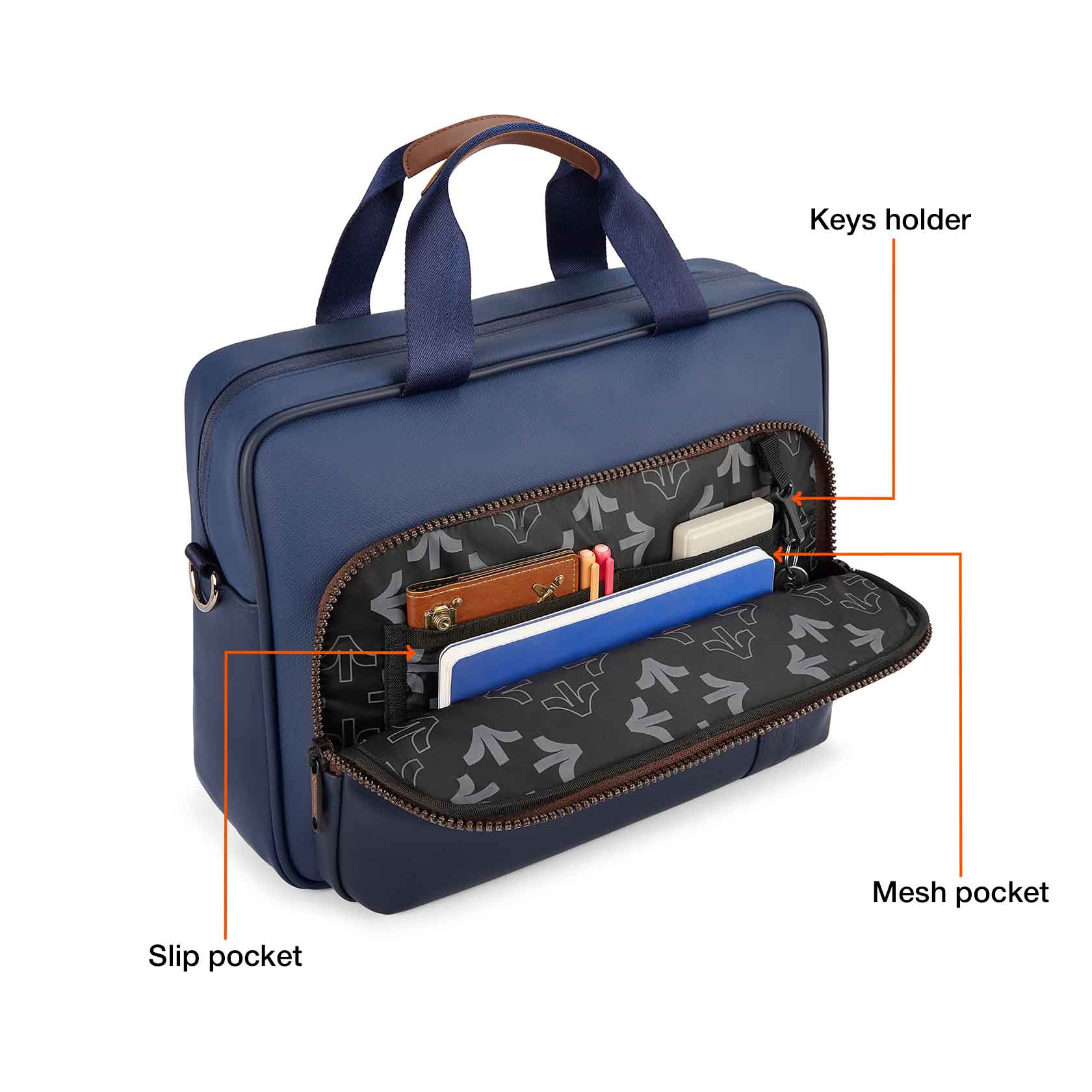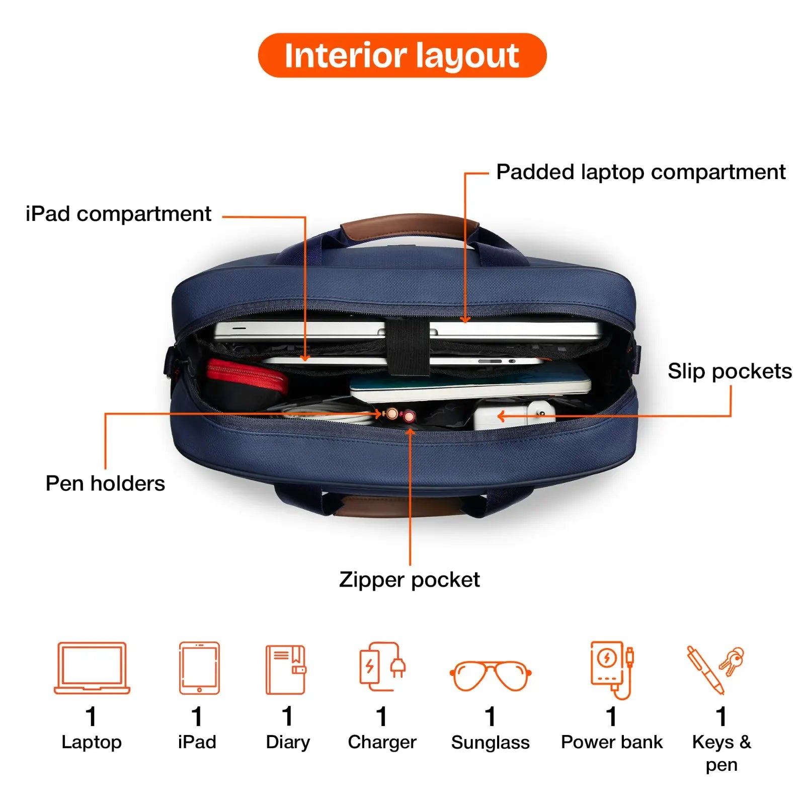Well-Structured Storage: Built for modern organization, this bag prevents clutter and ensures quick access to essentials. The main compartment features a laptop and tablet holder, a quick-access zipper pocket, 2 slip pockets, and 2 pen holders. The front zipper section includes a slip pocket, 2 mesh pockets, and a key holder—creating a versatile layout perfect for commuting, business, or travel.