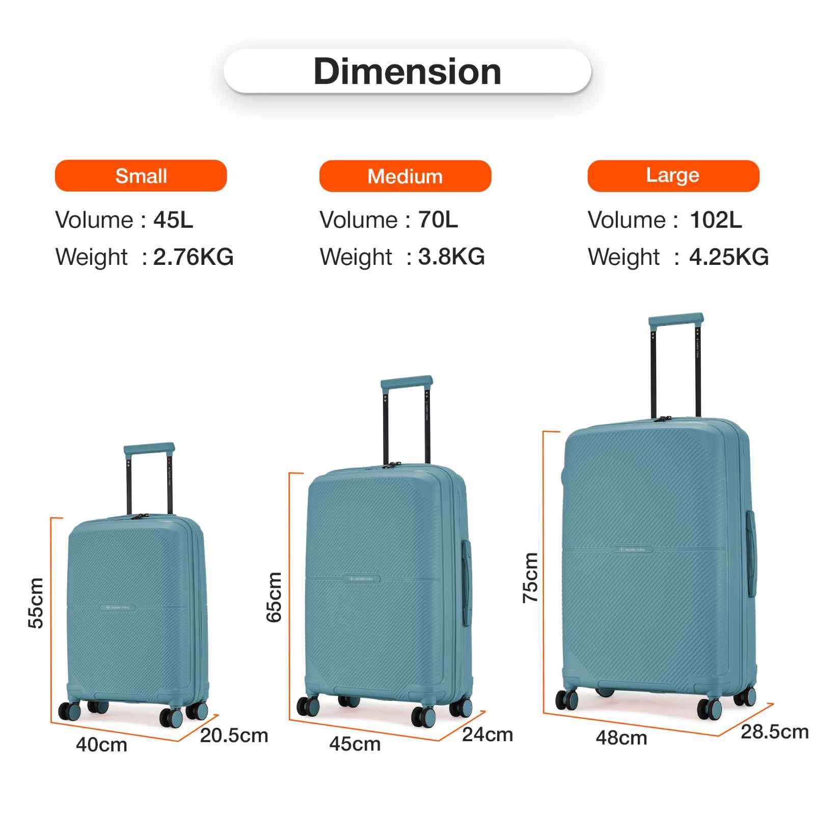 Small (S) Lightweight Hard-Side Cabin Luggage (55cm/20 inches): Travel with our cabin-sized luggage crafted from unbreakable polypropylene material, offering long-lasting durability and protection for your belongings. This compact luggage is designed to carry up to 15 kg of weight and can accommodate materials for a short trip of 2-3 days.