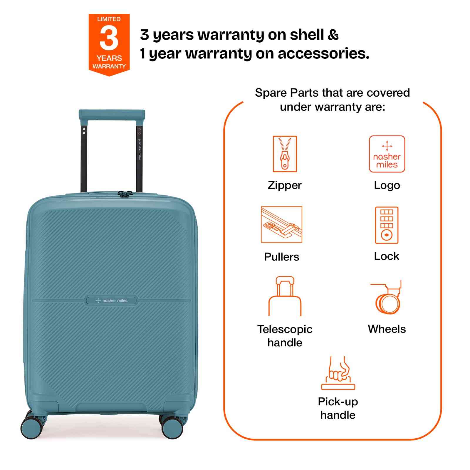 Warranty: 3 Years warranty on shell & 1 year warranty on accessories. Wear & Tear for product under use and scratches are not covered.