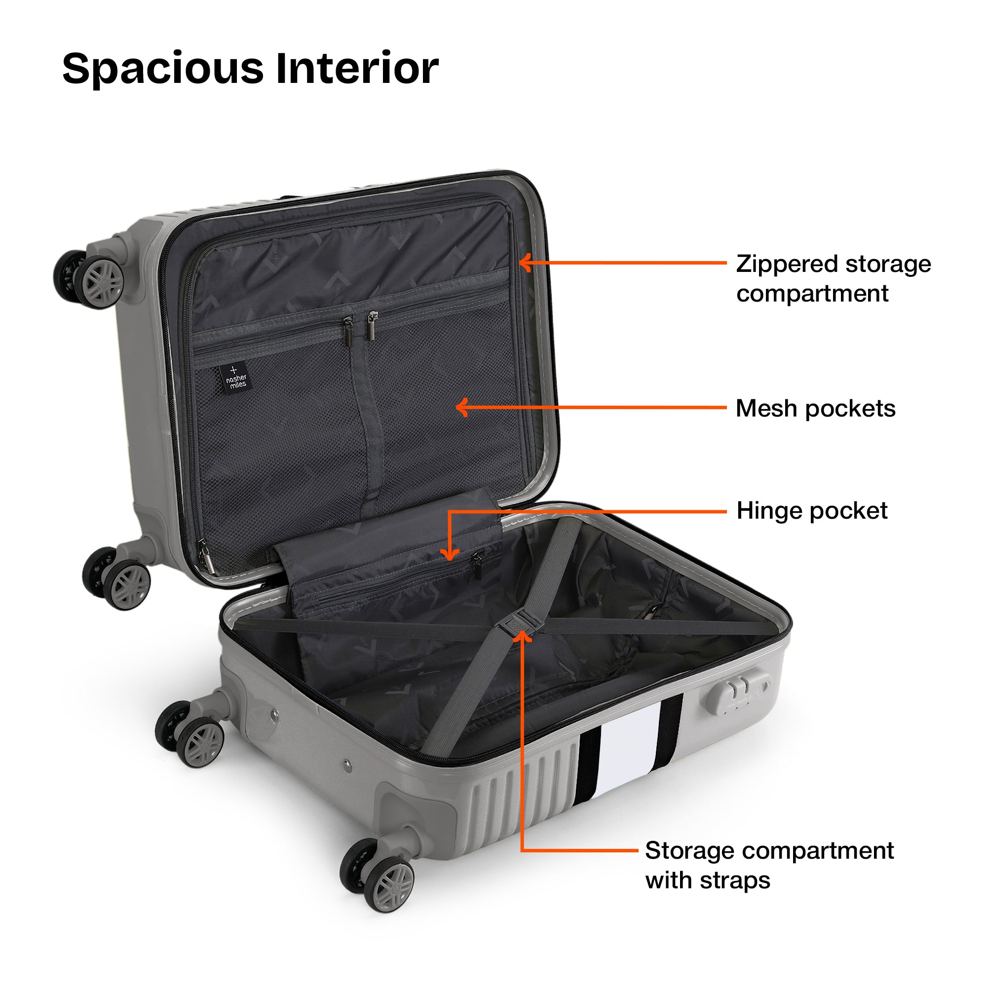 Smart Interior Organization: Unpack and access your items with ease. The bag features two spacious compartments organized with down straps and a zippered divider, along with two mesh pockets and a hinge pocket, providing a well-organized space for your belongings. Say goodbye to travel hassles and hello to a more seamless journey.