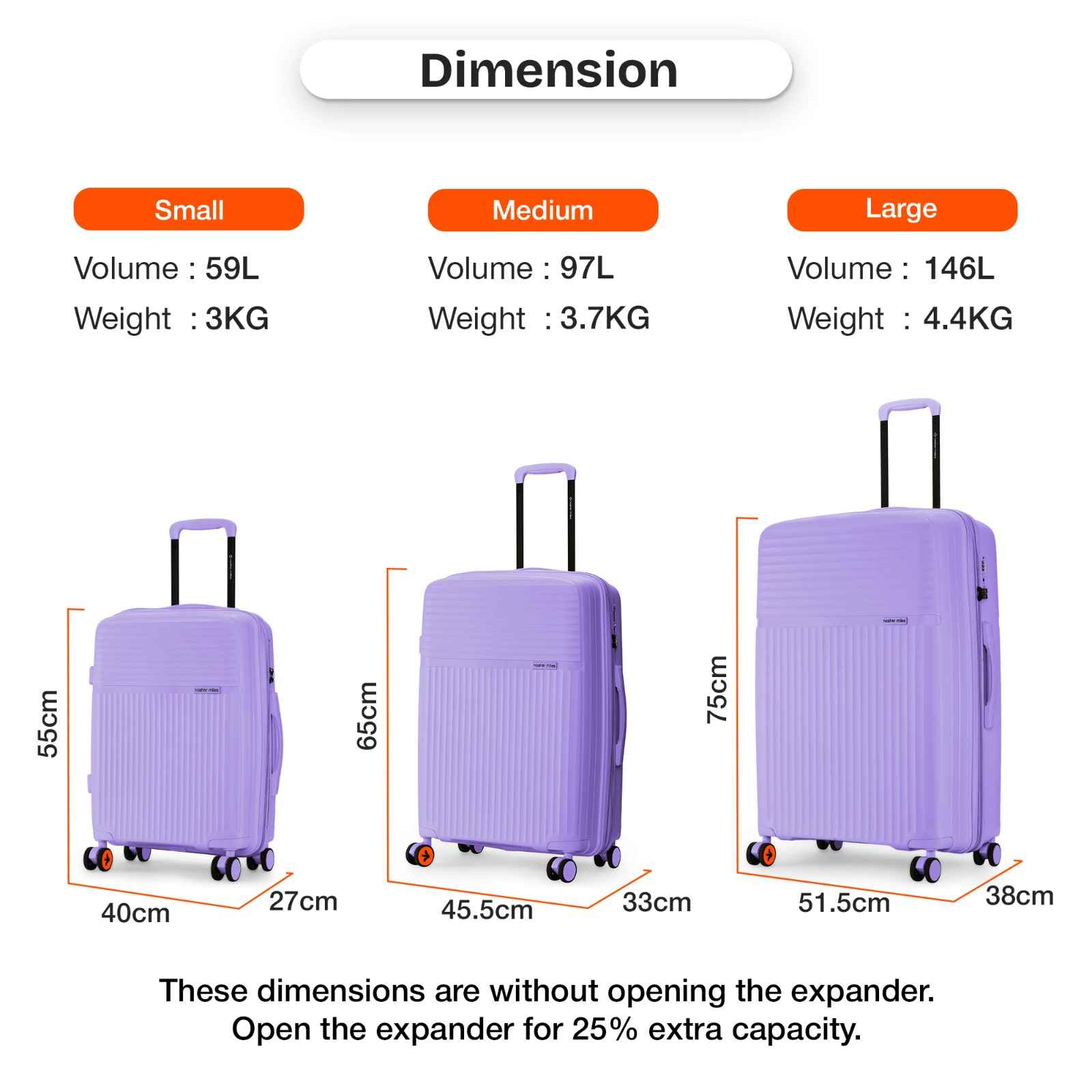 Large Lightweight Hard-Side Check-In Luggage (75cm/28 inches): Embrace exceptional capacity and durability with our large check-in luggage, crafted from unbreakable polypropylene. This luggage is designed to carry up to 25 kg of weight and can comfortably accommodate materials for a two-week trip or longer.