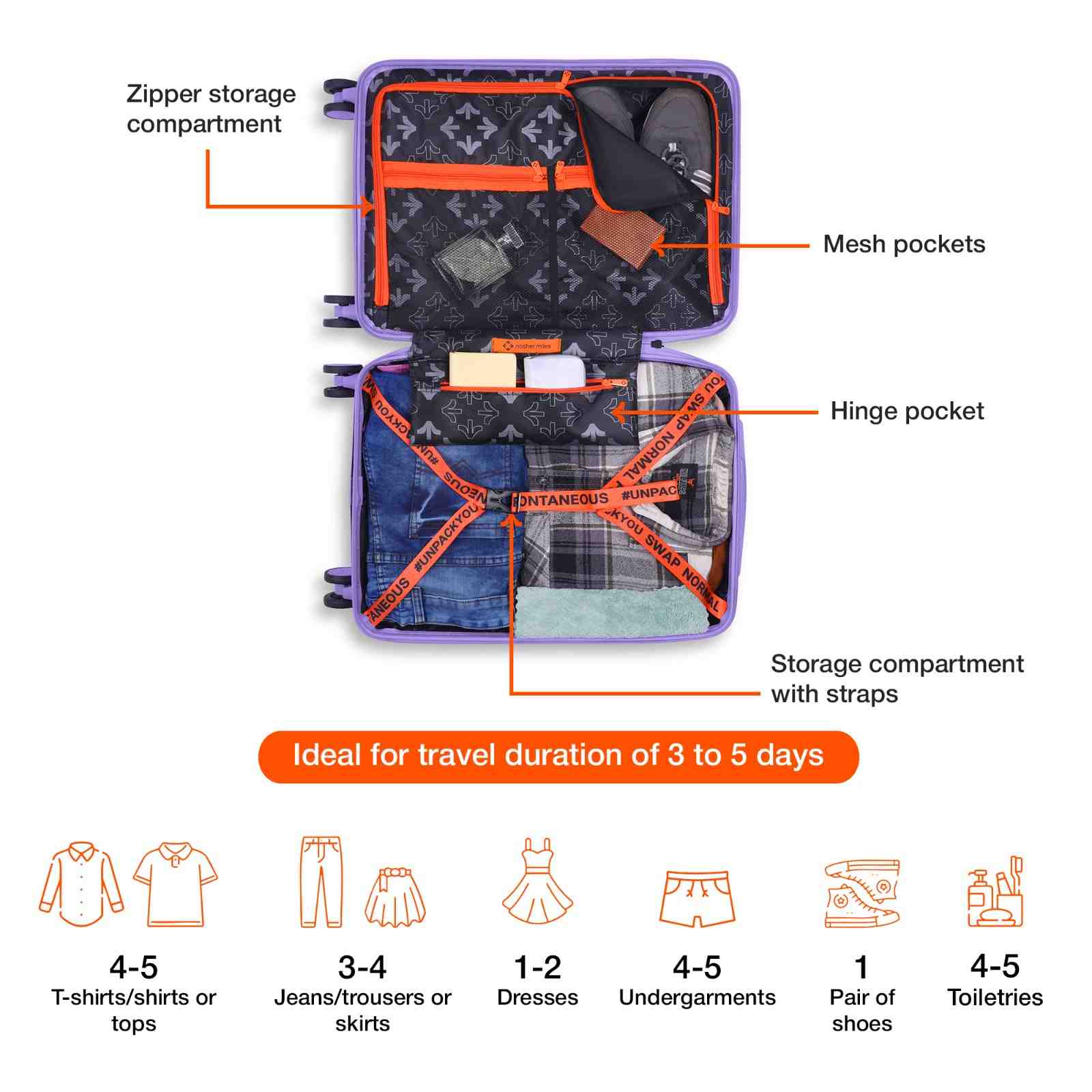 Expandable Design & Organized Packing: Enjoy the flexibility of an expandable design, allowing you to adjust the luggage's capacity to accommodate extra items when needed, paired with two spacious compartments, allowing you to neatly separate and access your belongings during travel.