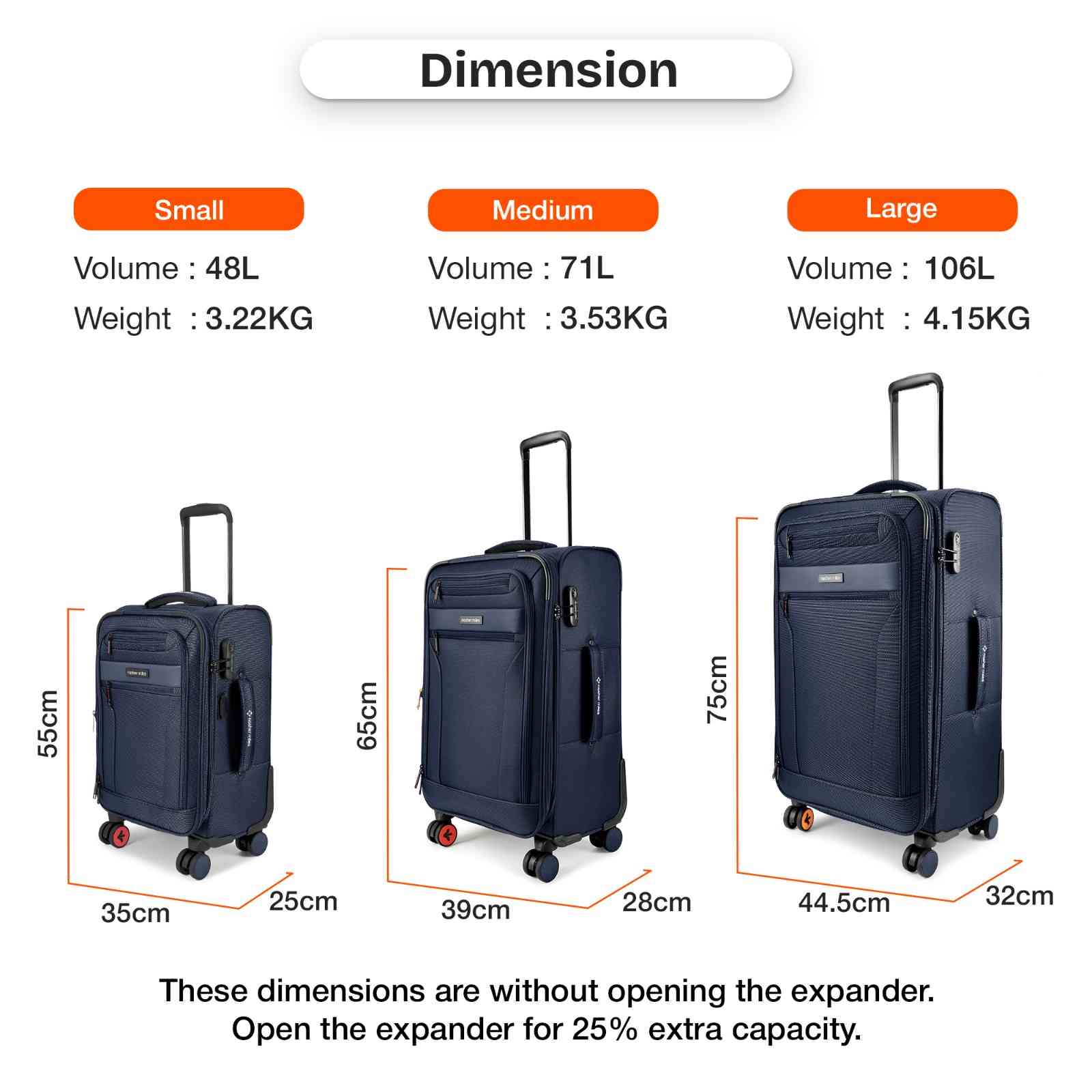 The luggage is two-toned and sports a stylish design on the front. Luggage is made from Dobby Nylon and Micro PU front which makes it very resilient, durable and lightweight. Nylon is the strongest of materials when it comes to soft bags. It comes with an expander option of up to 25% more packing capacity when needed.