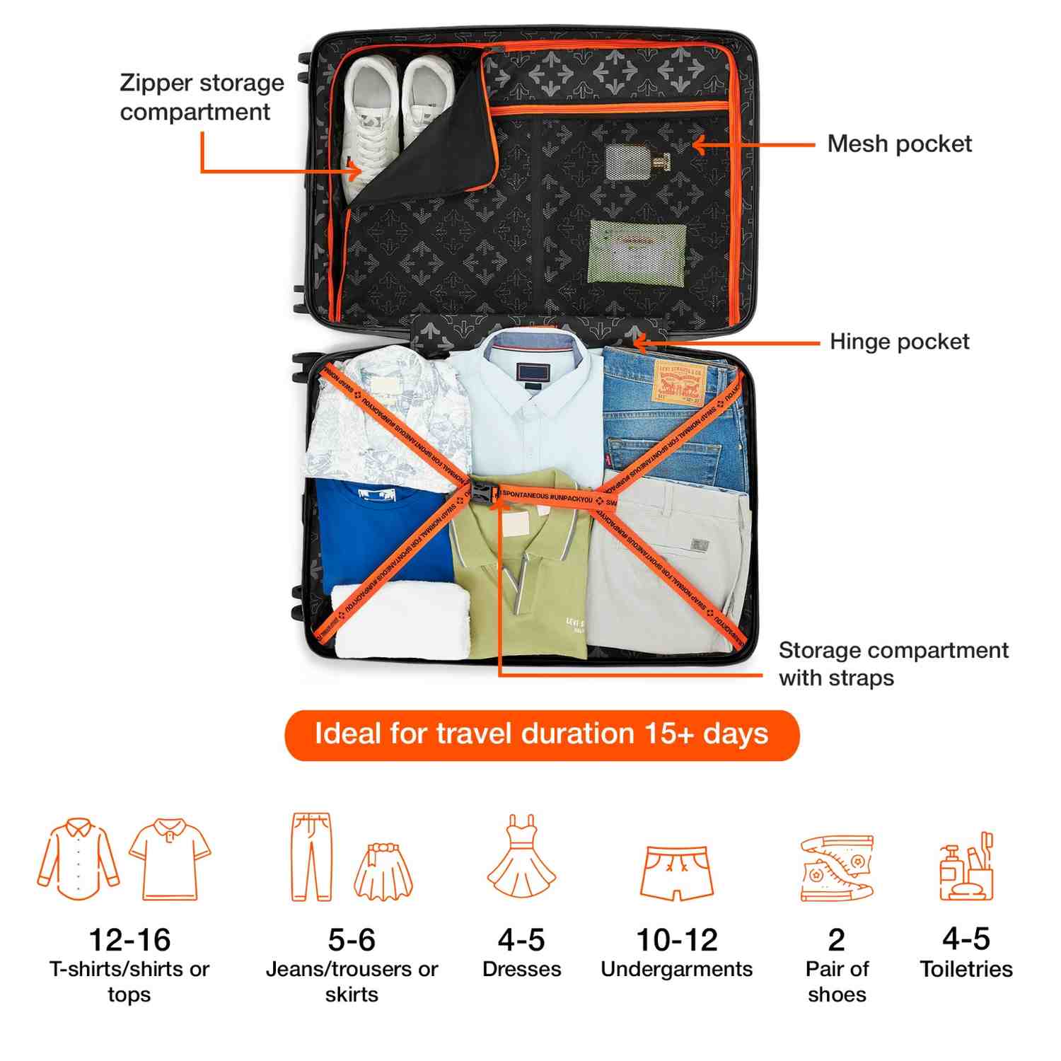 Spacious & Organized Interior: The interior is designed for maximum packing efficiency, featuring multiple compartments and adjustable straps to keep your clothes, accessories, and electronics neatly organized. The mesh pockets provide easy access to small items like toiletries or chargers.