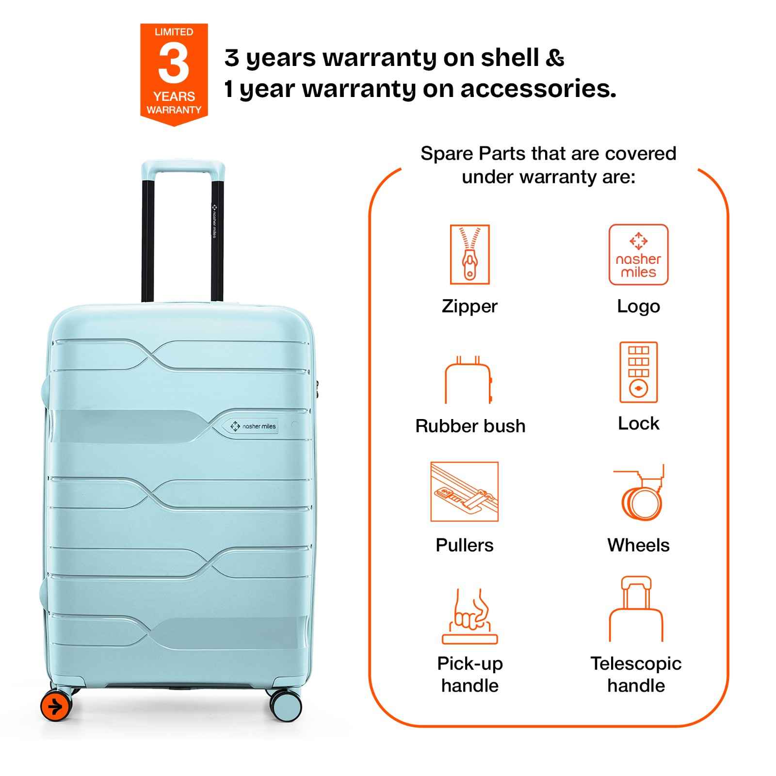 3 Years warranty on shell & 1 year warranty on accessories. Wear & Tear for product under use and scratches are not covered.