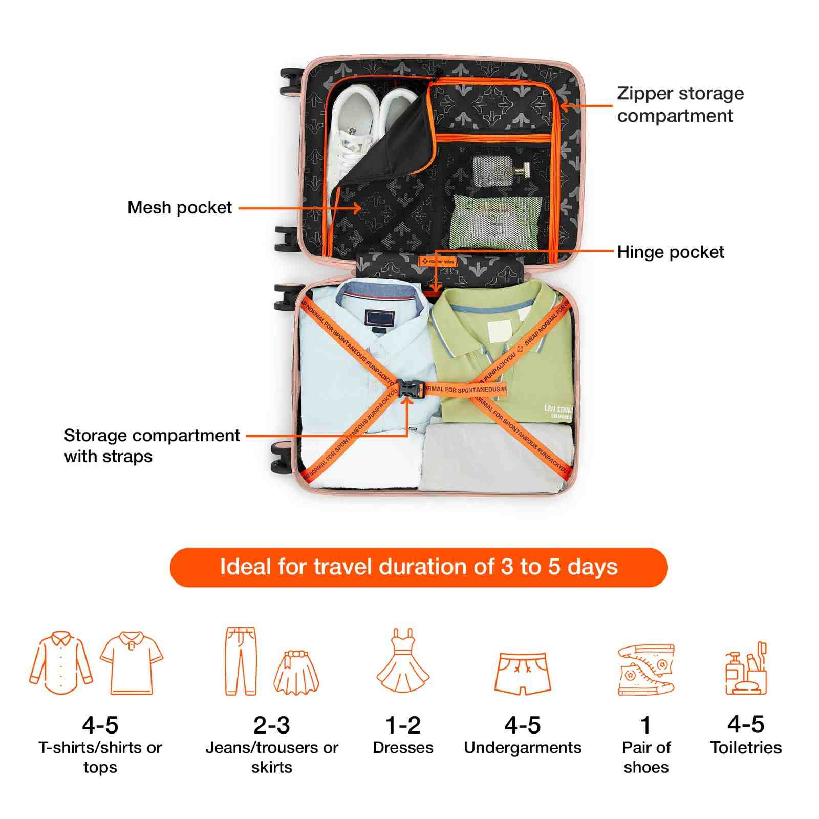 Spacious & Organized Interior: The interior is designed for maximum packing efficiency, featuring multiple compartments and adjustable straps to keep your clothes, accessories, and electronics neatly organized. The mesh pockets provide easy access to small items like toiletries or chargers.