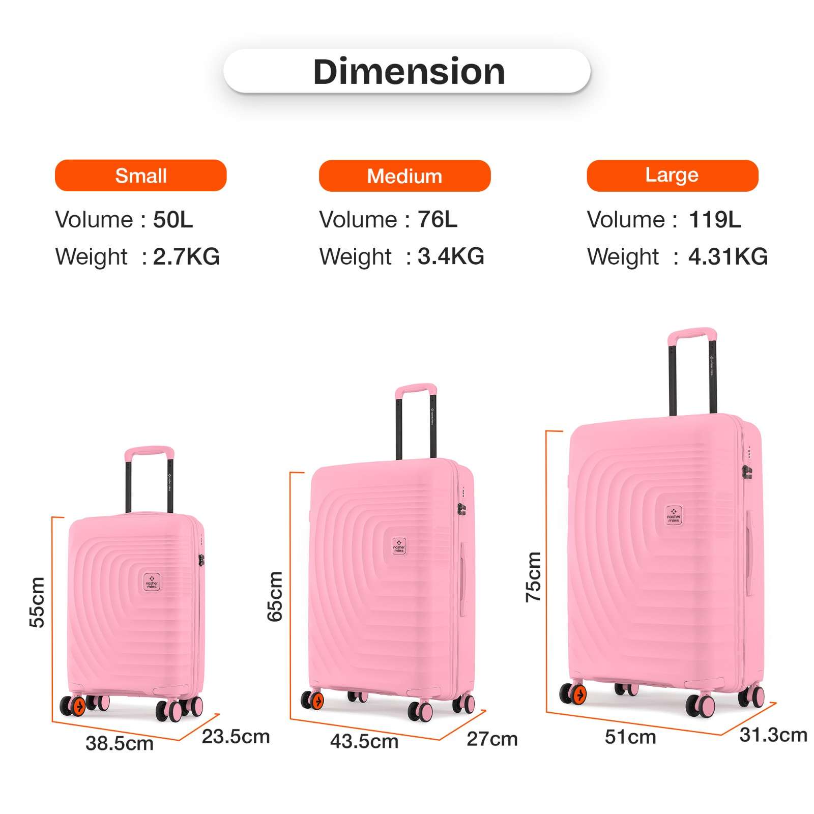 Carry-On Small (S): With a compact 20-inch size, this carry-on suitcase is ideal for travel duration ranging from 1 to 5 days, making it the perfect companion for weekend getaways, business trips, or quick vacations. Suitcase can hold weight up to 8 Kg.