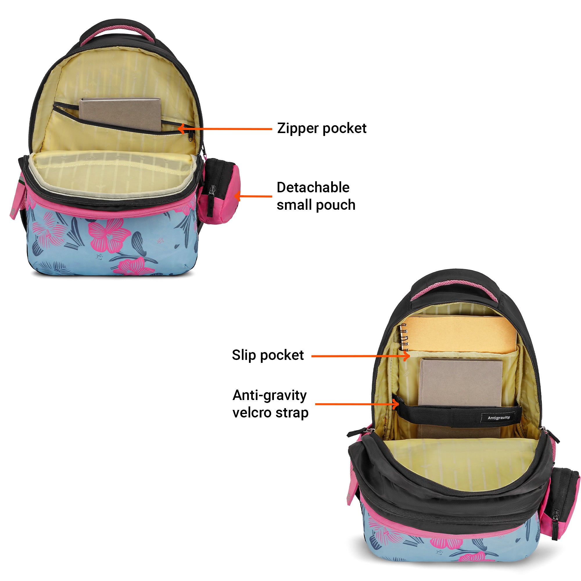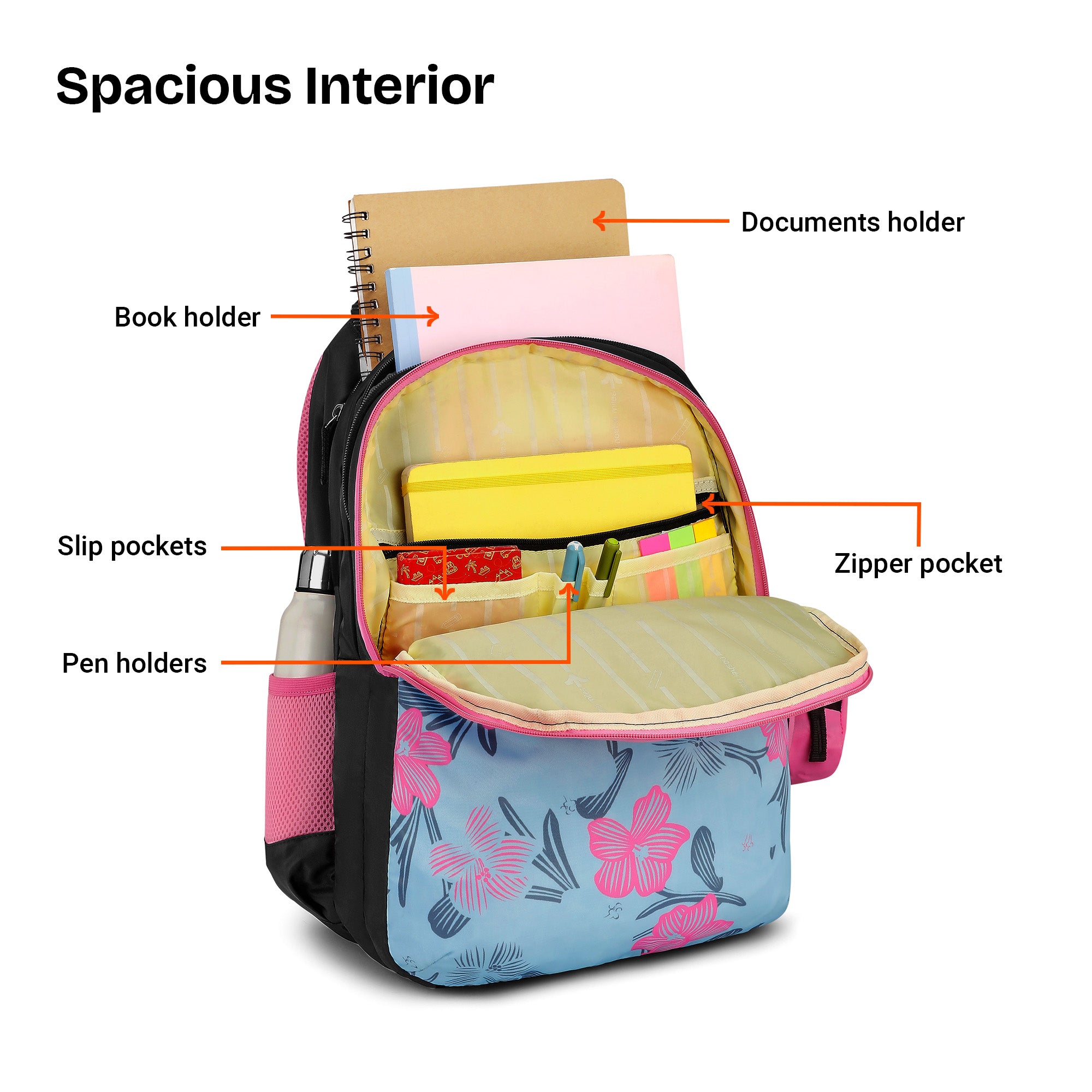 Structured Storage Layout: This backpack features a front zipper quick-access compartment for daily essentials. The first compartment offers dual-side organization with a mesh zipper pocket and slip pockets on one side, and a zipper pocket, slip pockets, and pen holders on the other. The spacious main compartment fits books and documents, while the third compartment includes a dedicated laptop section with a zipper pocket. Two outside bottle pockets add convenience.