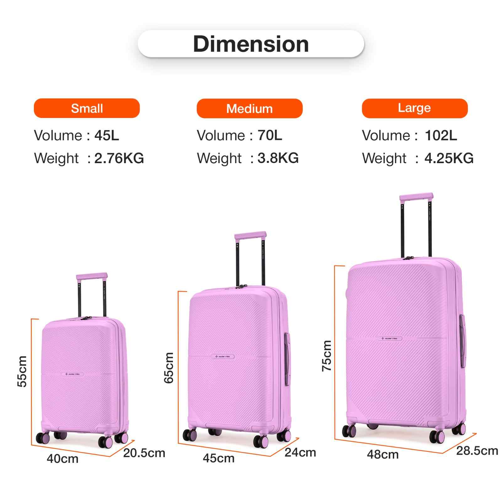 Medium Lightweight Hard-Side Check-In Luggage (65cm/24 inches): Experience the perfect balance of space and convenience with our medium-sized check-in luggage. Made from sturdy polypropylene, this durable bag offers plenty of room and dependable protection for your travel gear. Ideal for extended trips or business travel, it can carry up to 20 kg and has ample space for a week’s worth of items or more.