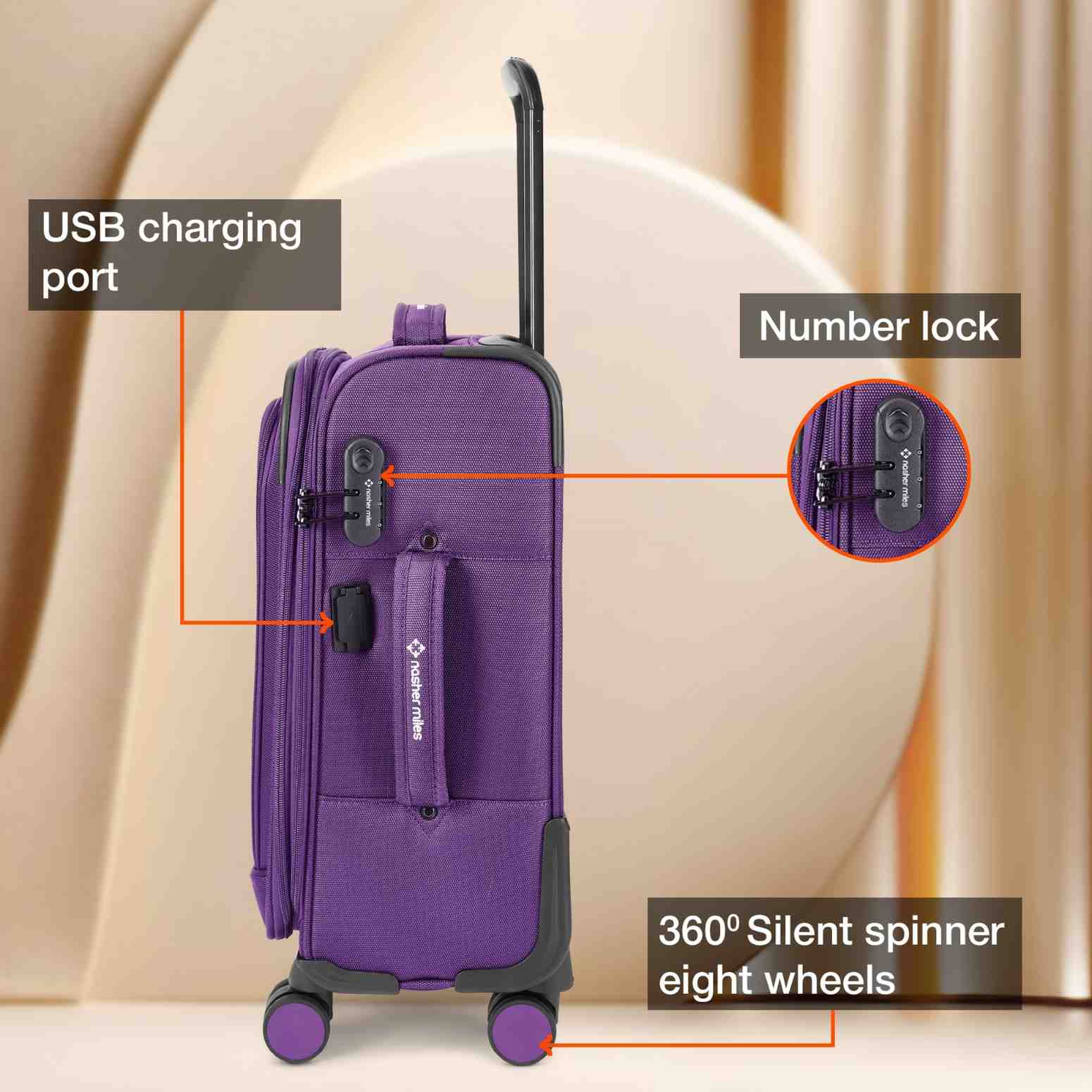 Telescopic handle for comfortable maneuvering and securely mounted short handle for easy lateral pickup. 8 silent spinner wheels with 360 degrees rotation for effortless mobility in any direction. Each bag has a separate number lock (pre-set code 0-0-0) to ensure security of your bag.