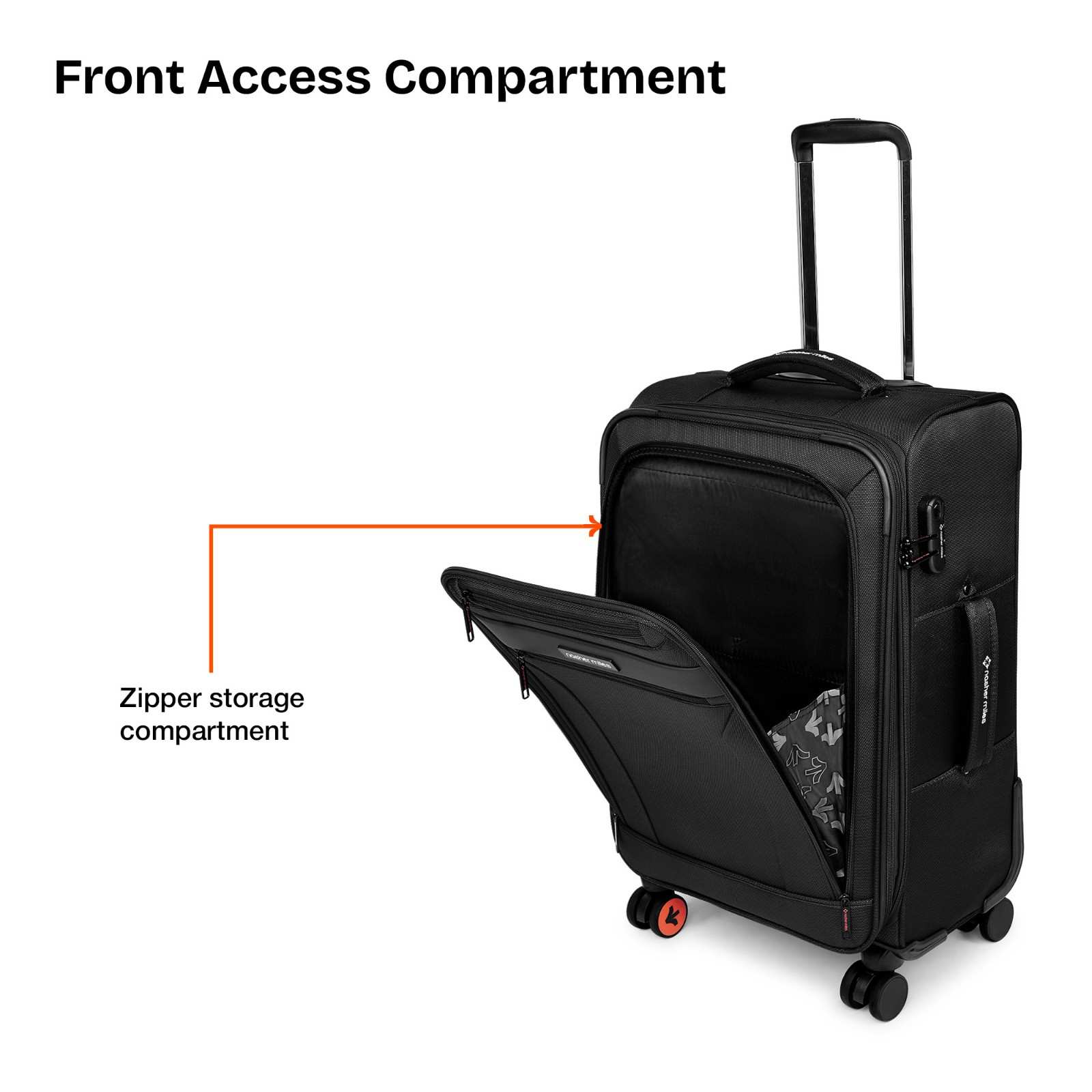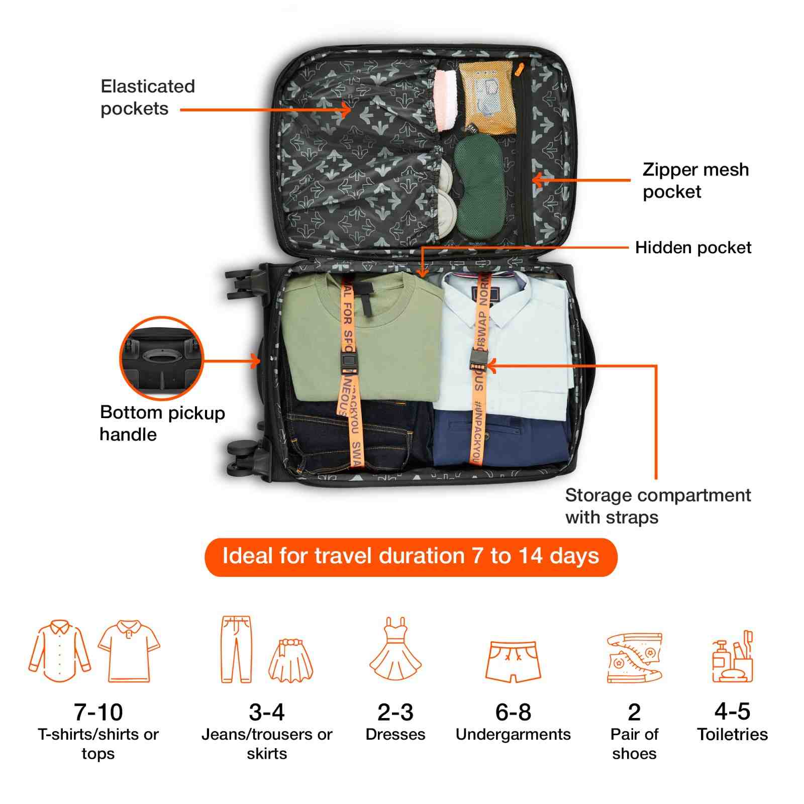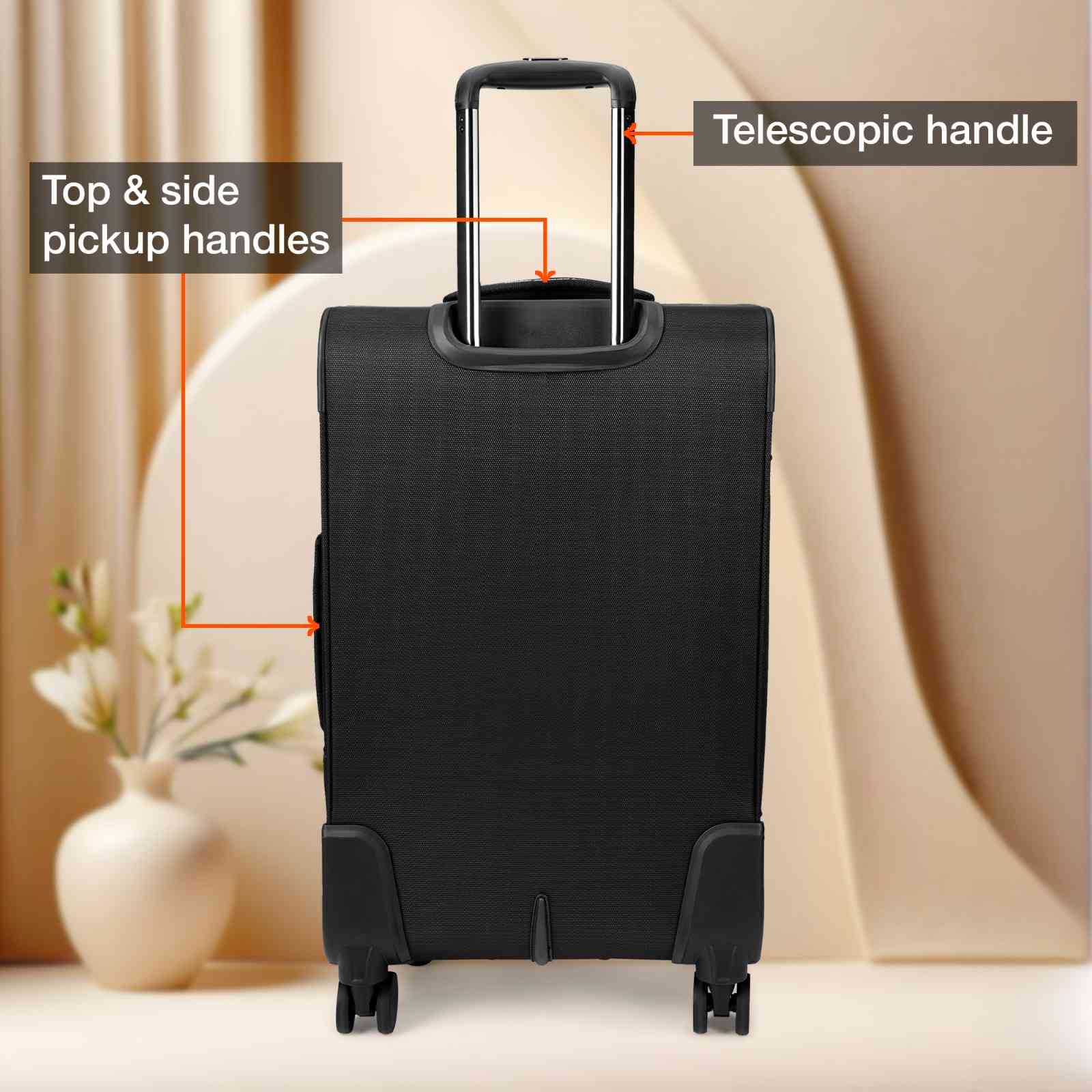 Telescopic handle for comfortable maneuvering and securely mounted short handle, for easy lateral pickup. A top carry handle for convenient lifting also available. Spacious main compartment to keep your clothes, shoes and travel essentials.