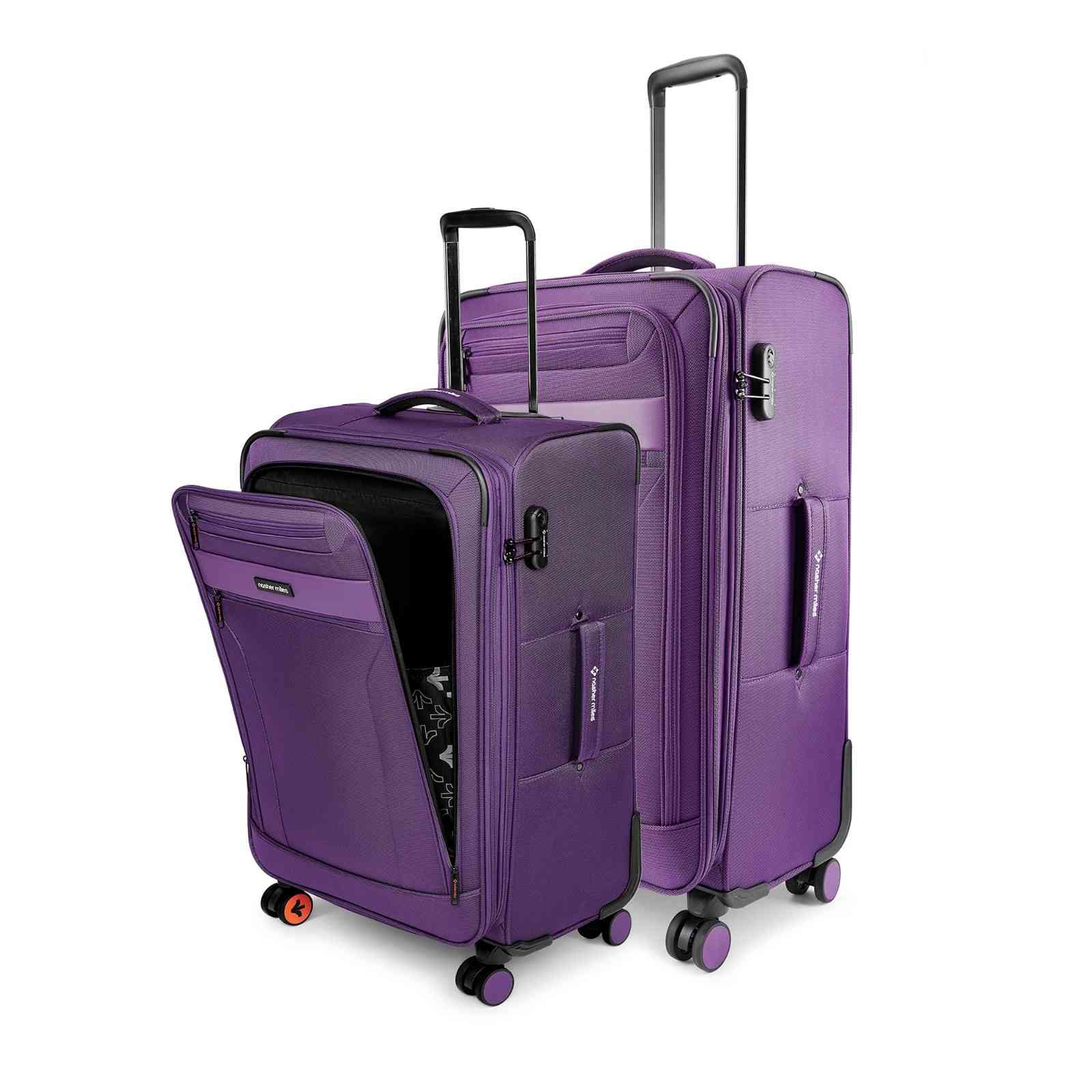 Soft sided, two toned, lightweight 2 piece polyester luggage set includes the following sizes: Medium(M) - 65 cm and Large (L) - 75 cm. The luggage is two-toned and sports a stylish design on the front.