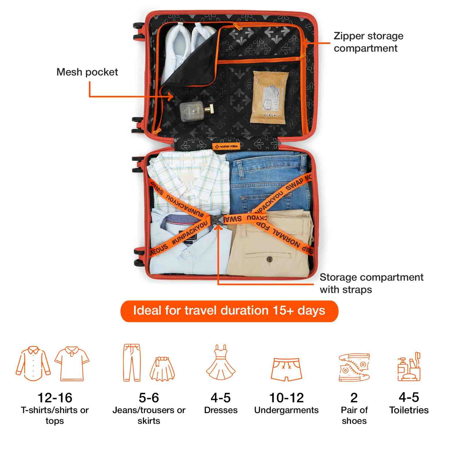 Optimal Organization: Our luggage offers a fully lined spacious interior including down straps and a zippered divider for secure organization. Additionally, there are two mesh pockets to make packing easier. Whether it's clothes, gadgets, toiletries, or travel documents, there’s a space for everything. Each bag has a separate number lock.