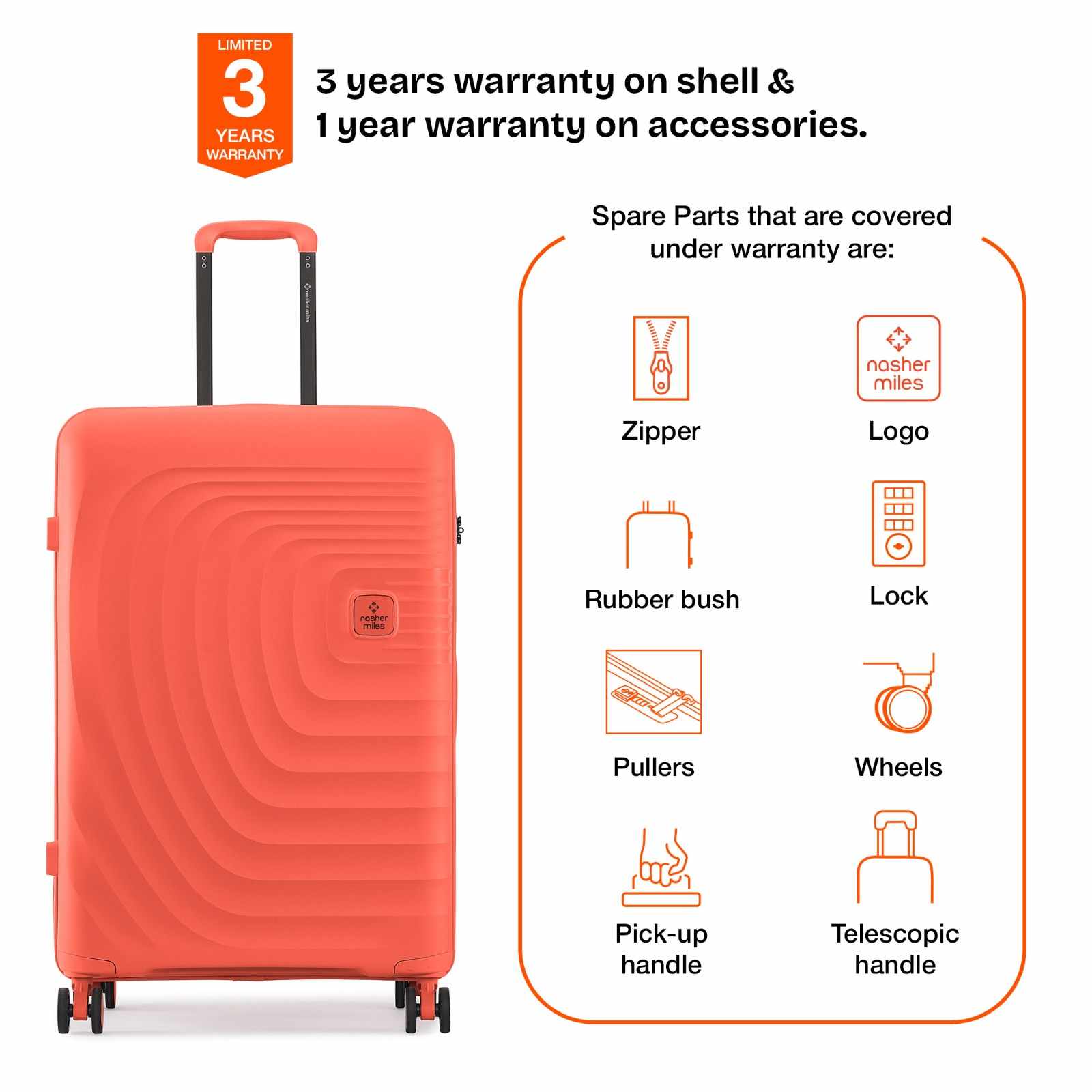 Warranty: 3 Years warranty on shell & 1 year warranty on accessories. Wear & Tear for product under use and scratches are not covered.