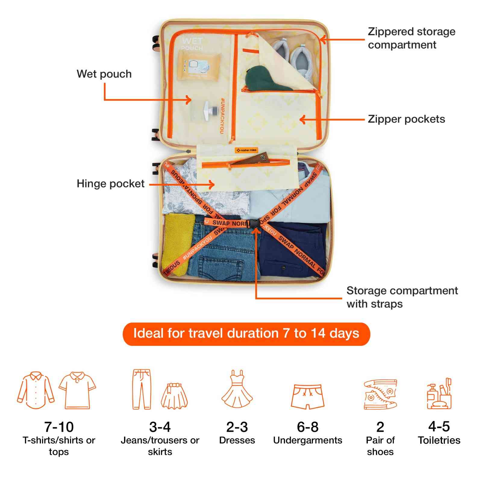 Smart Interior Organization: The interior is thoughtfully crafted with a premium lining and multiple storage solutions to keep your belongings perfectly arranged. It includes compression straps to secure clothing, zippered mesh compartments for essentials, a dedicated wet pouch for toiletries or damp items, and additional mesh pockets for smaller accessories. Designed to keep everything neat, visible, and easily accessible—so you stay organized and mess-free throughout your journey.
