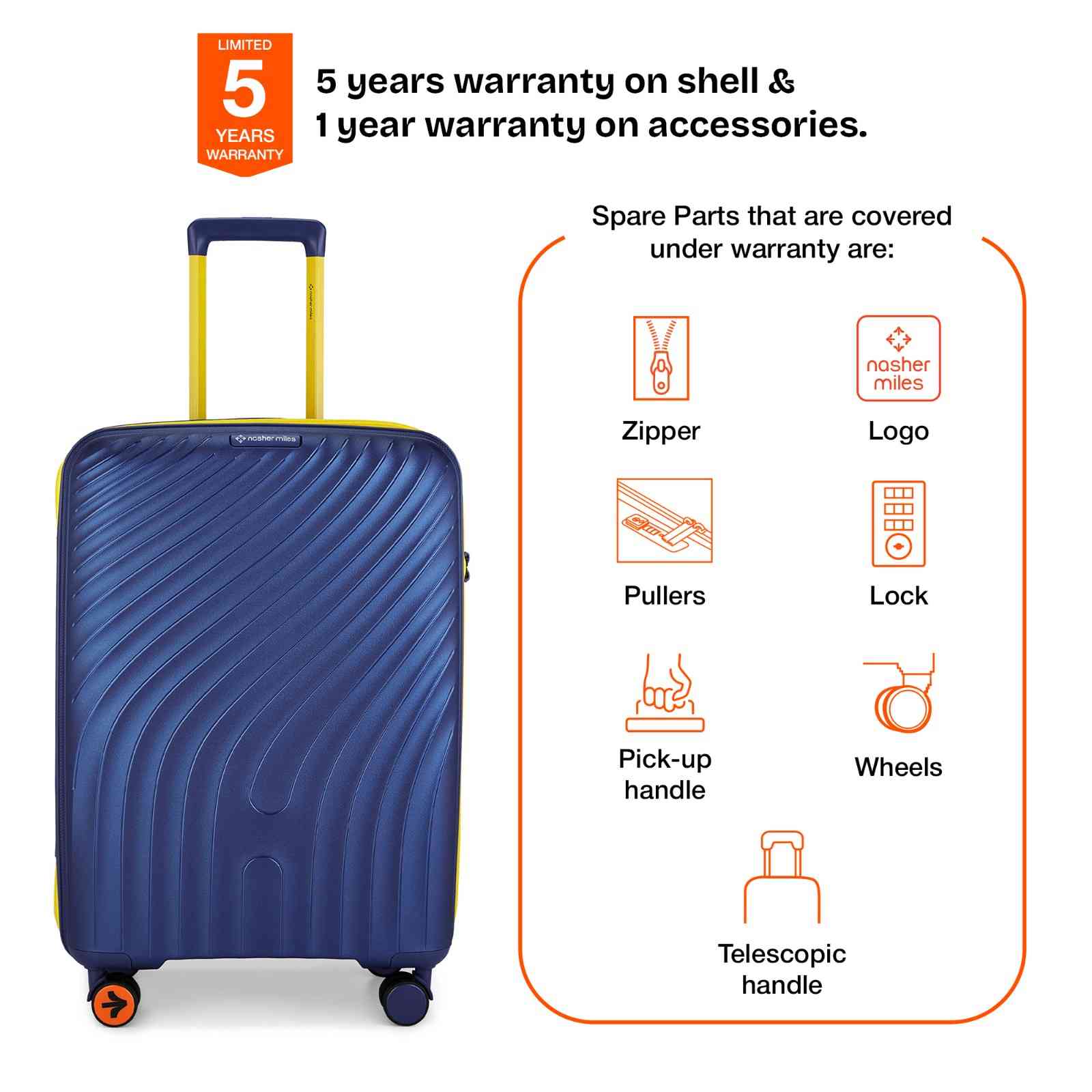 Warranty: 5 years warranty on shell & 1 year warranty on accessories. Wear & tear for products under use and scratches are not covered.