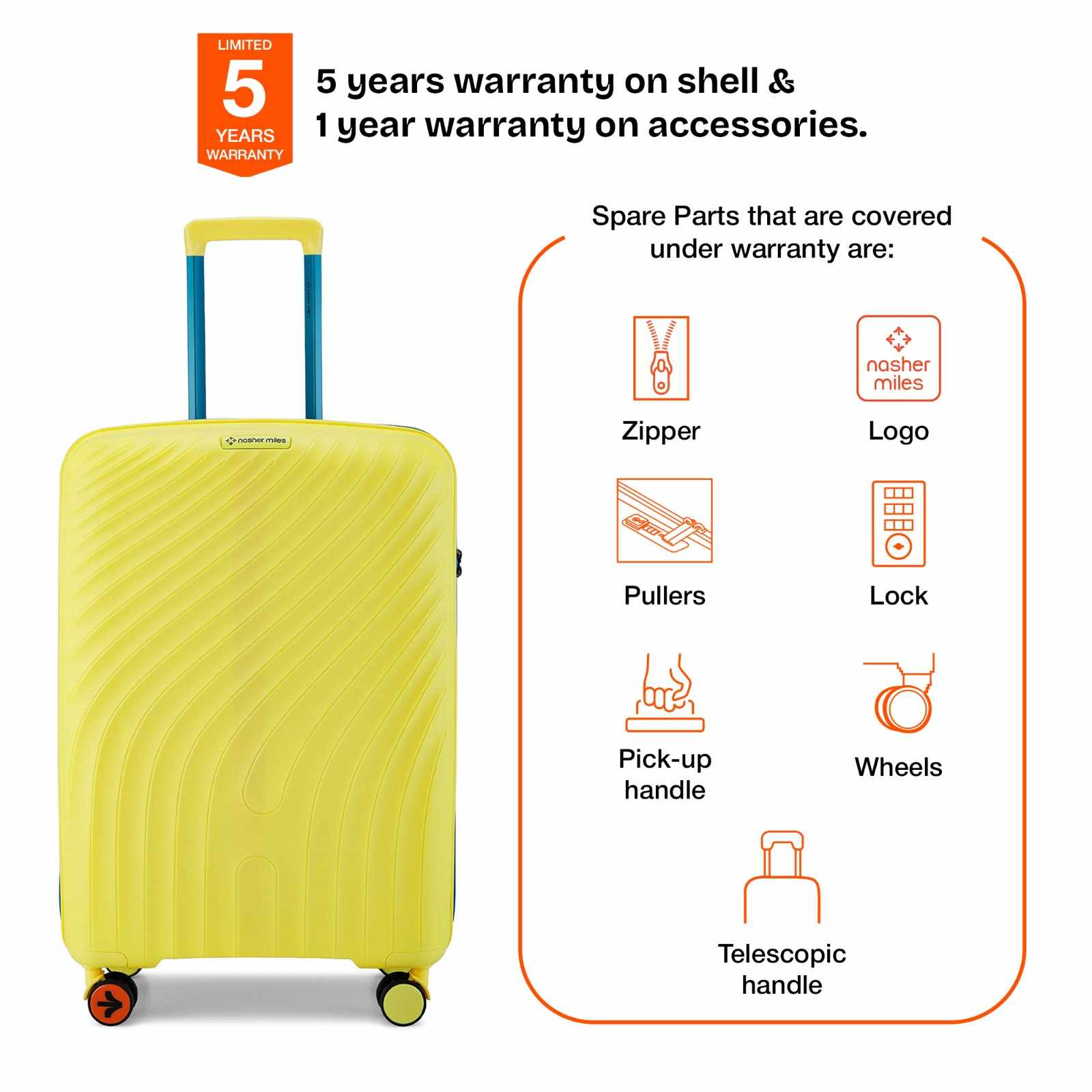 Warranty: 5 years warranty on shell & 1 year warranty on accessories. Wear & tear for products under use and scratches are not covered.