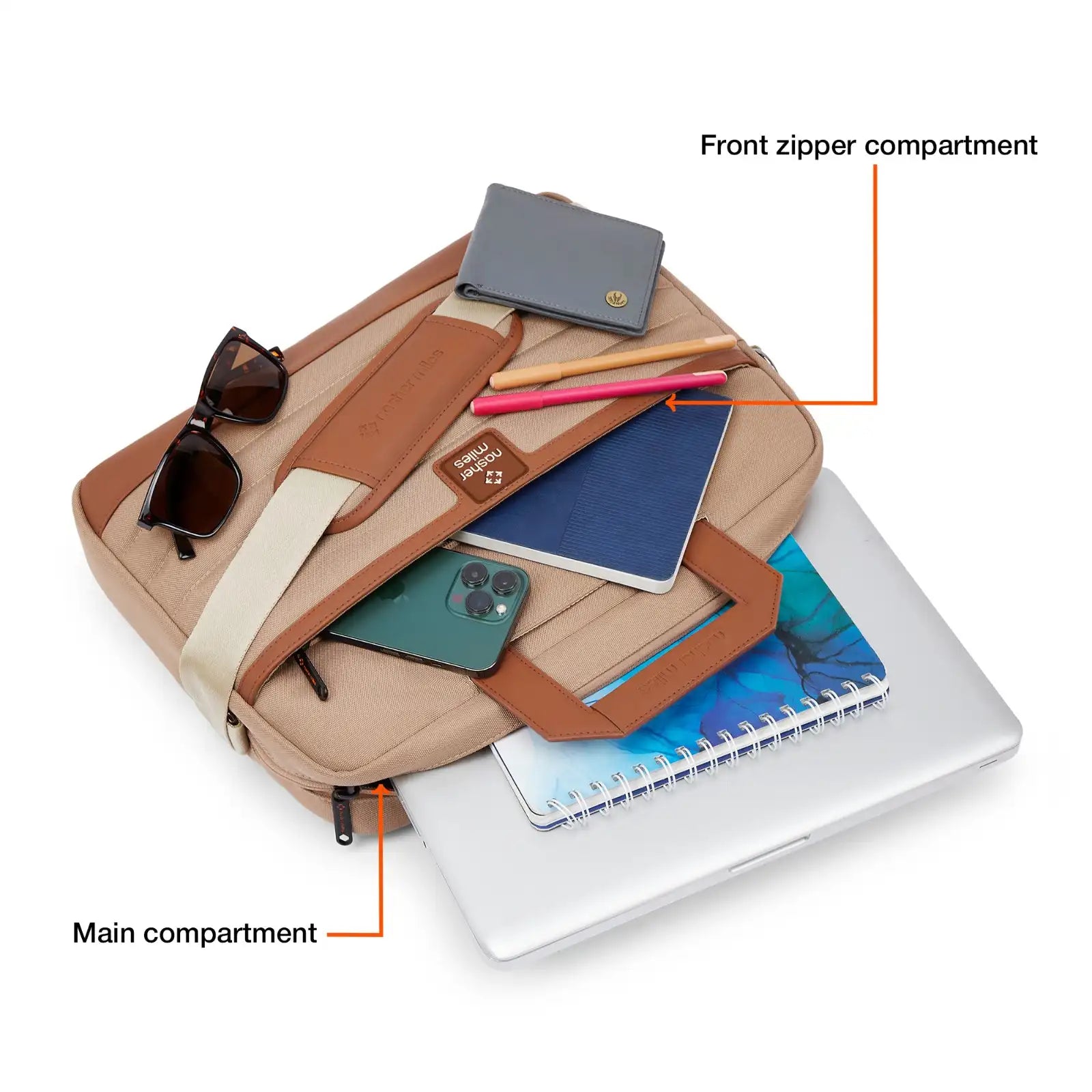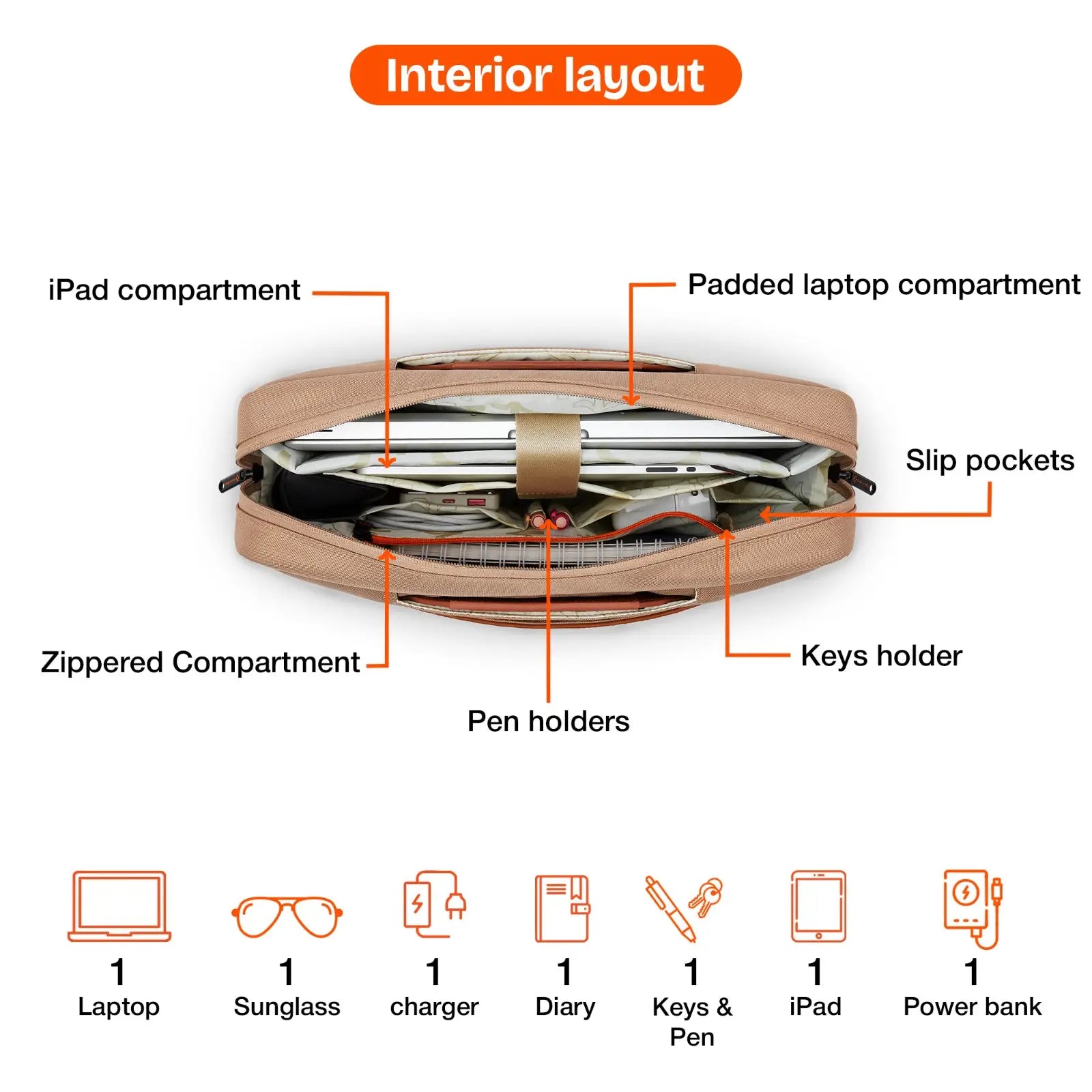 Compact Storage: Stay efficient on the go with a compact interior layout that keeps everything neatly arranged. The main compartment accommodates laptops, tablets, and documents, while multiple organizer pockets—including slip sections, pen holders, a zippered pocket, and a key holder—ensure smaller accessories like chargers, cables, and keys stay neatly in place. A front zipper pocket ensures quick access to frequently used items, making daily commutes, office work, or business trips.