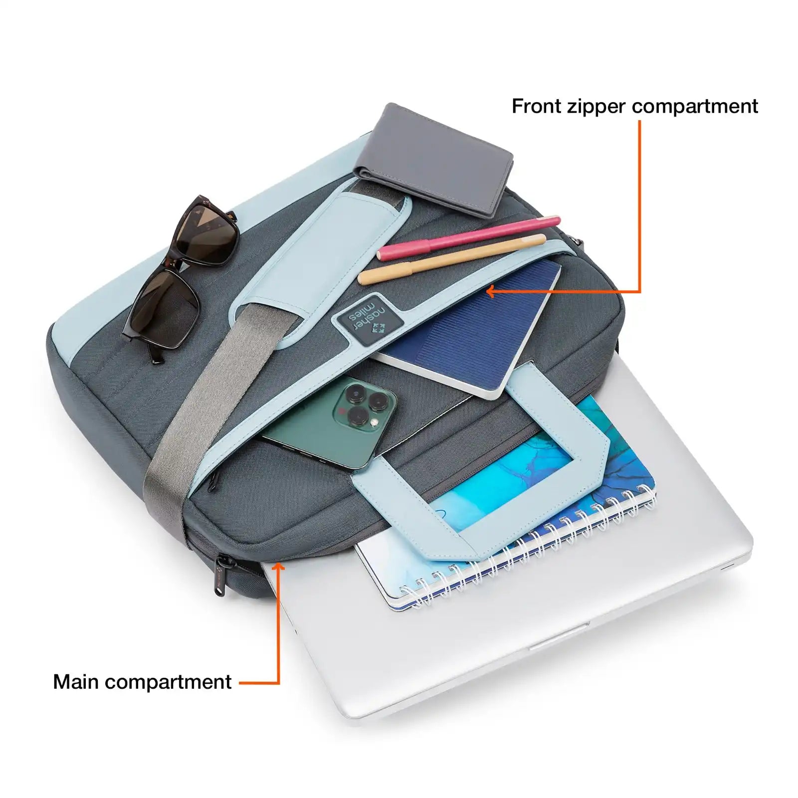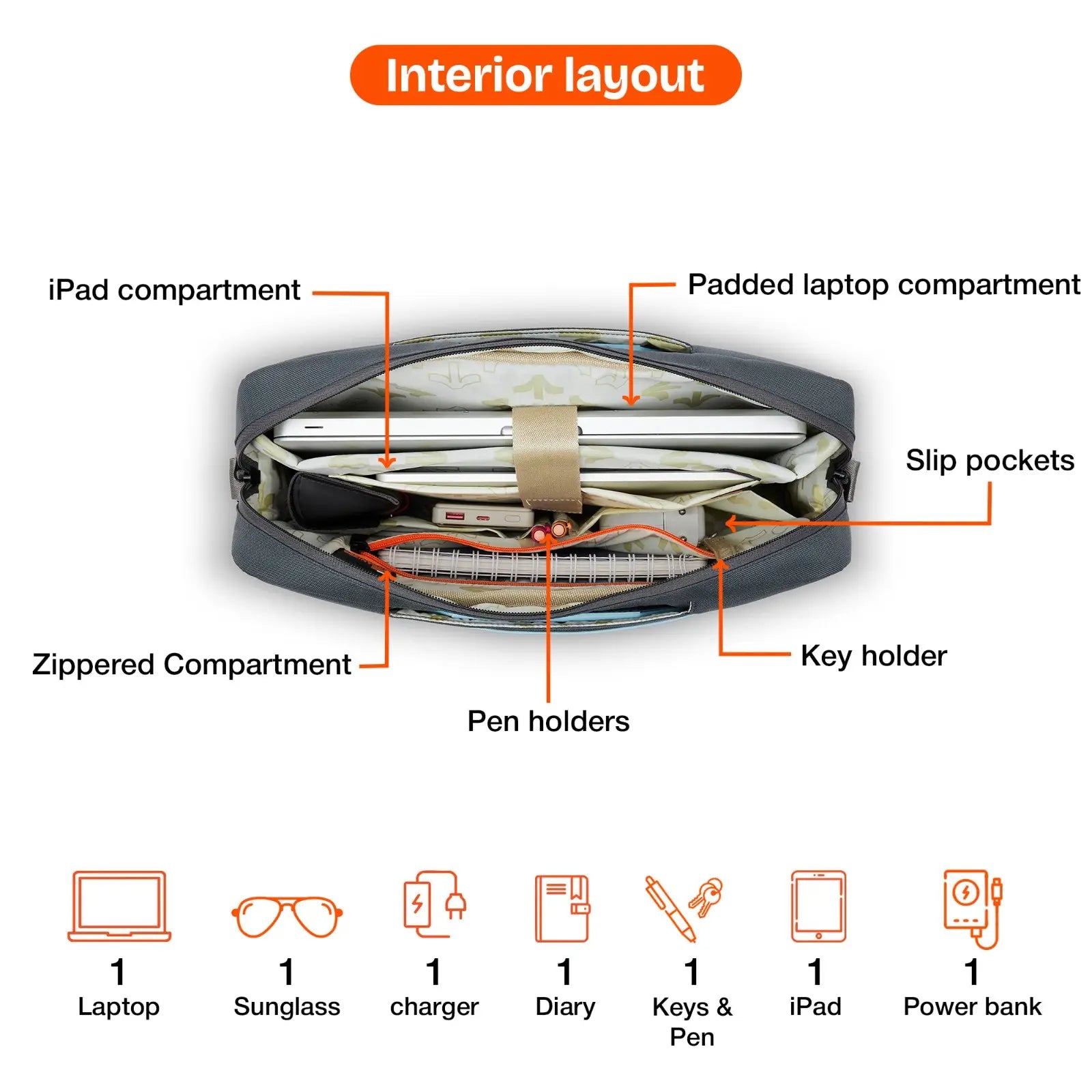 Compact Storage: Stay efficient on the go with a compact interior layout that keeps everything neatly arranged. The main compartment accommodates laptops, tablets, and documents, while multiple organizer pockets—including slip sections, pen holders, a zippered pocket, and a key holder—ensure smaller accessories like chargers, cables, and keys stay neatly in place. A front zipper pocket ensures quick access to frequently used items, making daily commutes, office work, or business trips.