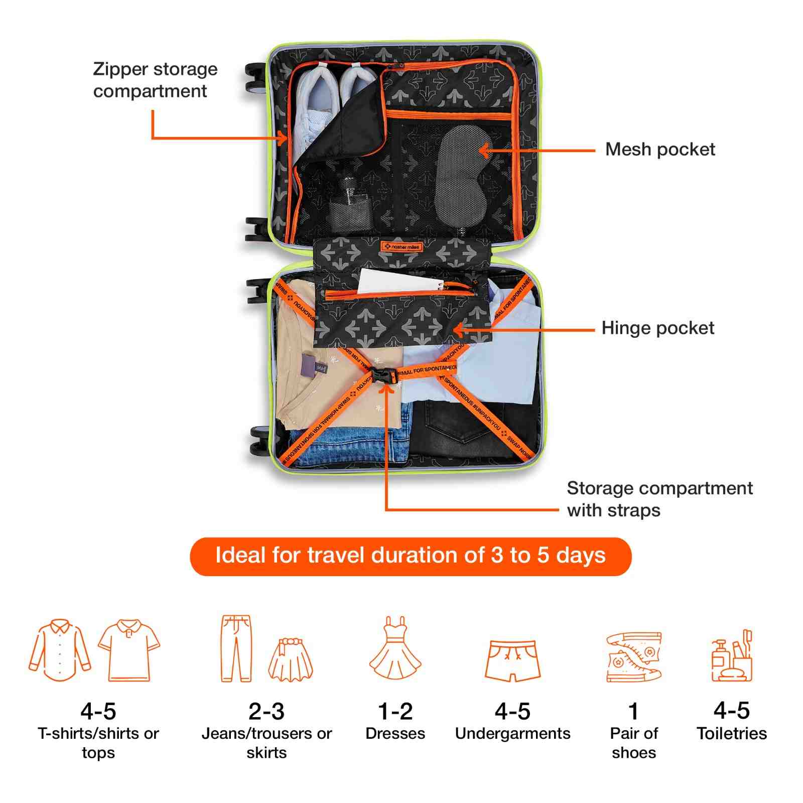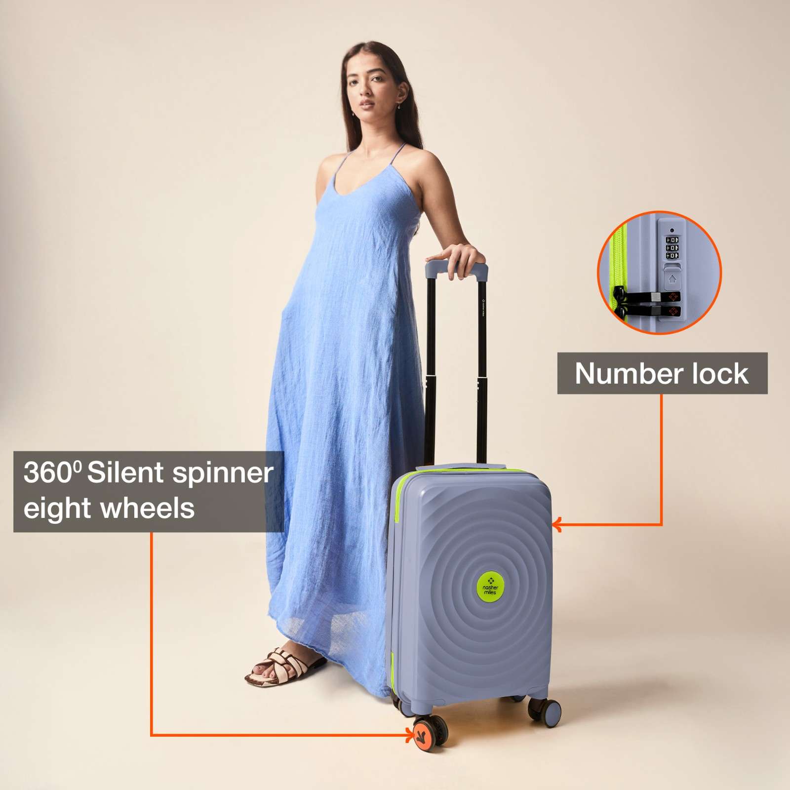 Matching accessories: The Goa bags come with contrasting zippers, handles and wheels . Iron telescopic handle for comfortable maneuvering. 8 silent spinner wheels with 360 degrees rotation for effortless mobility in any direction. Each bag has a separate number lock (pre-set code 0-0-0) to ensure security of your bag.