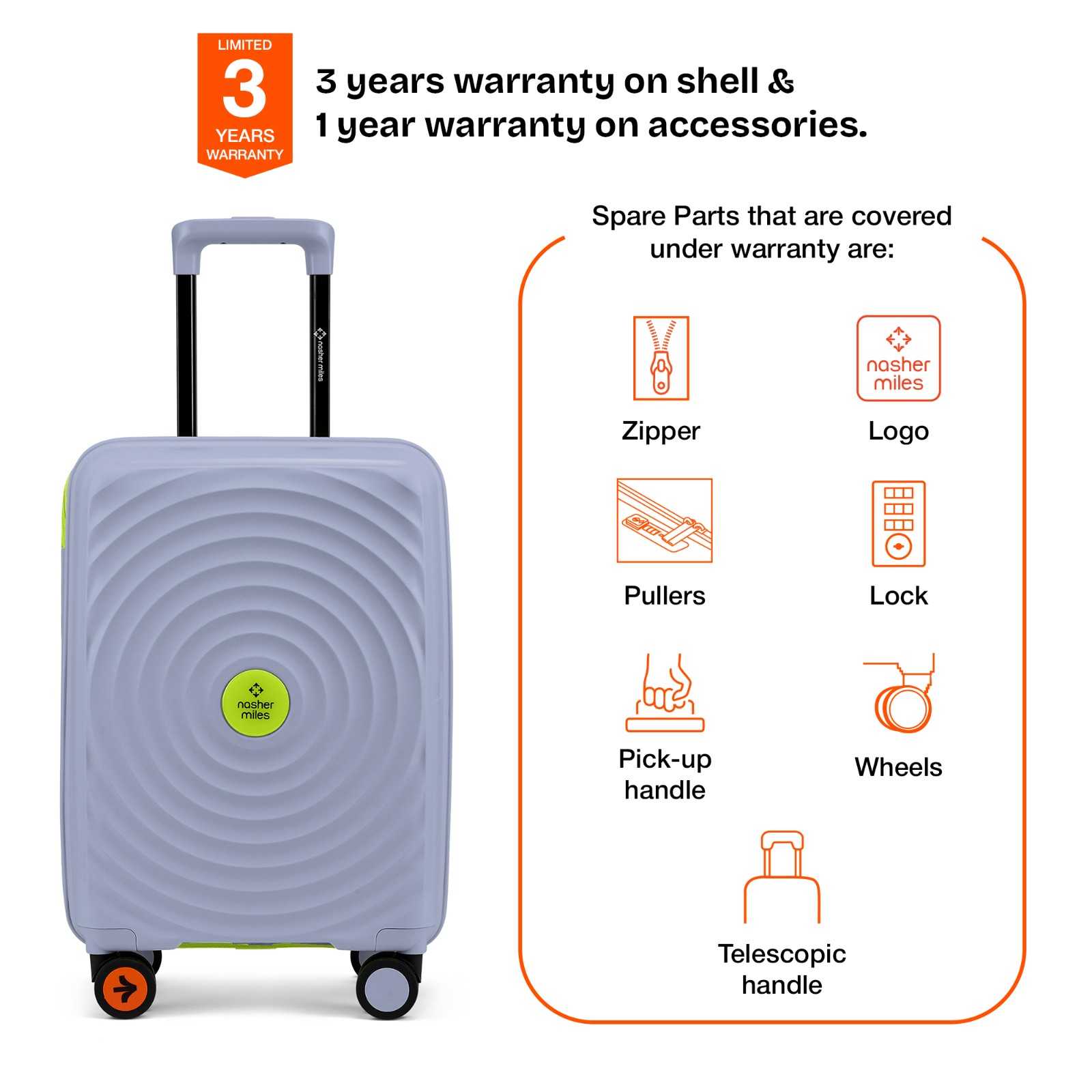 3 Years warranty on shell & 1 year warranty on accessories. Wear & Tear for product under use and scratches are not covered.