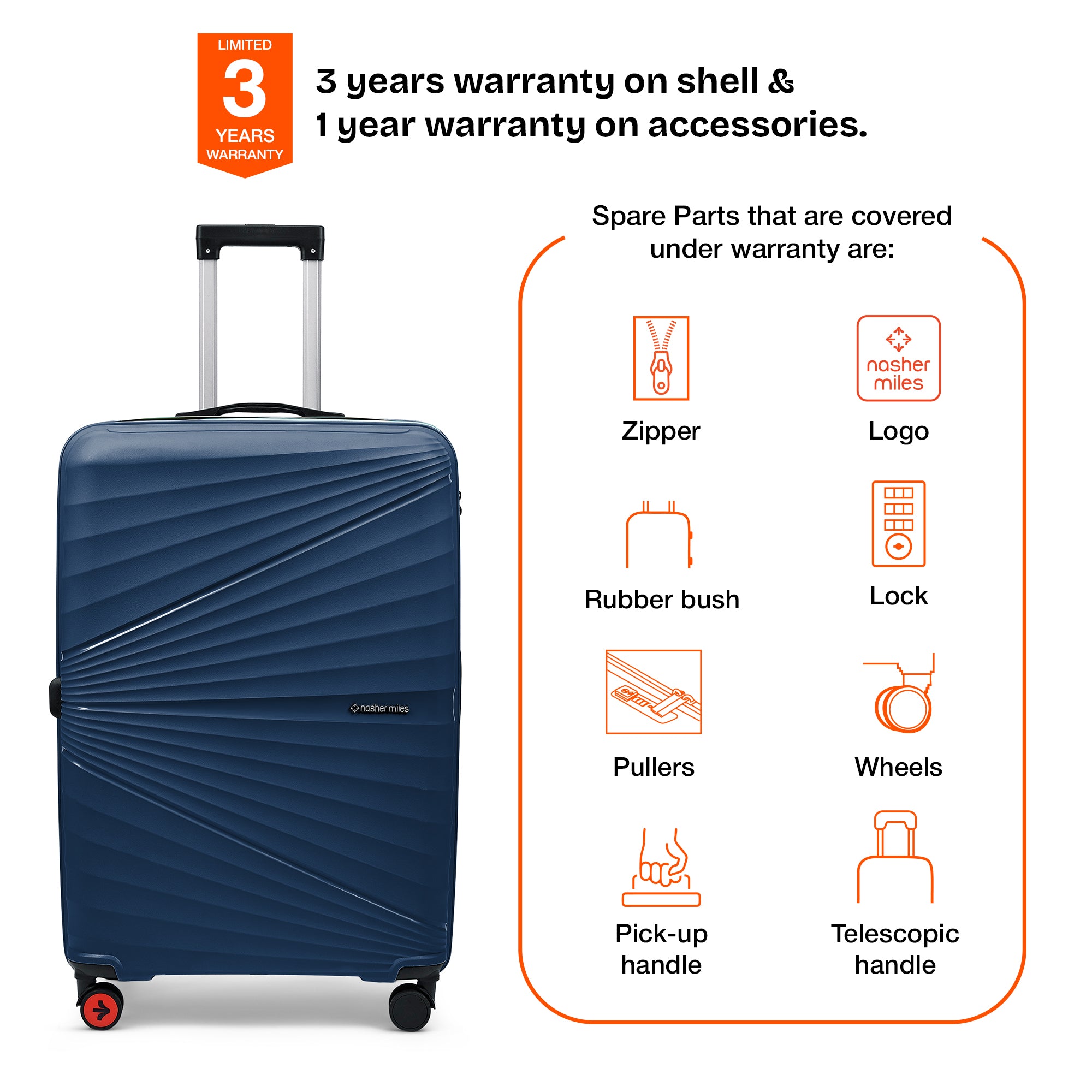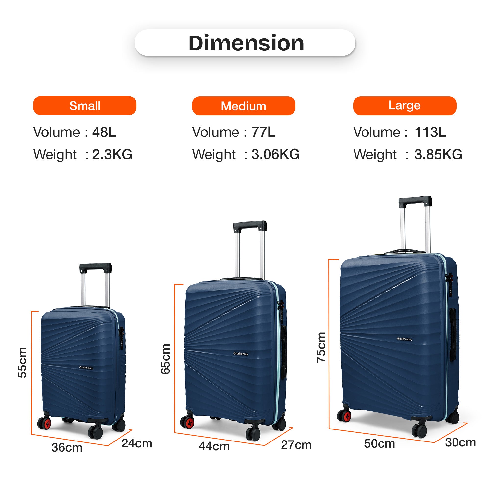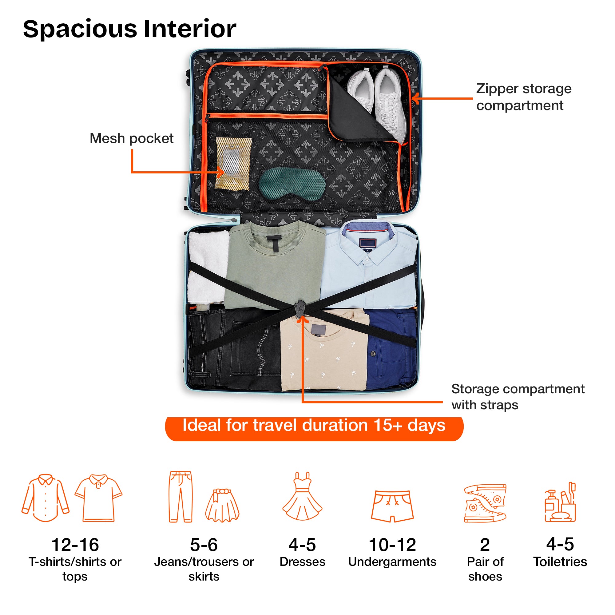 Check-In Large (L): With a 28-inch size, this check-in suitcase is ideal for travel duration lasting than a week, making it the perfect companion for weekend getaways, business trips, or vacations. Suitcase can hold weight up to 20 Kg.