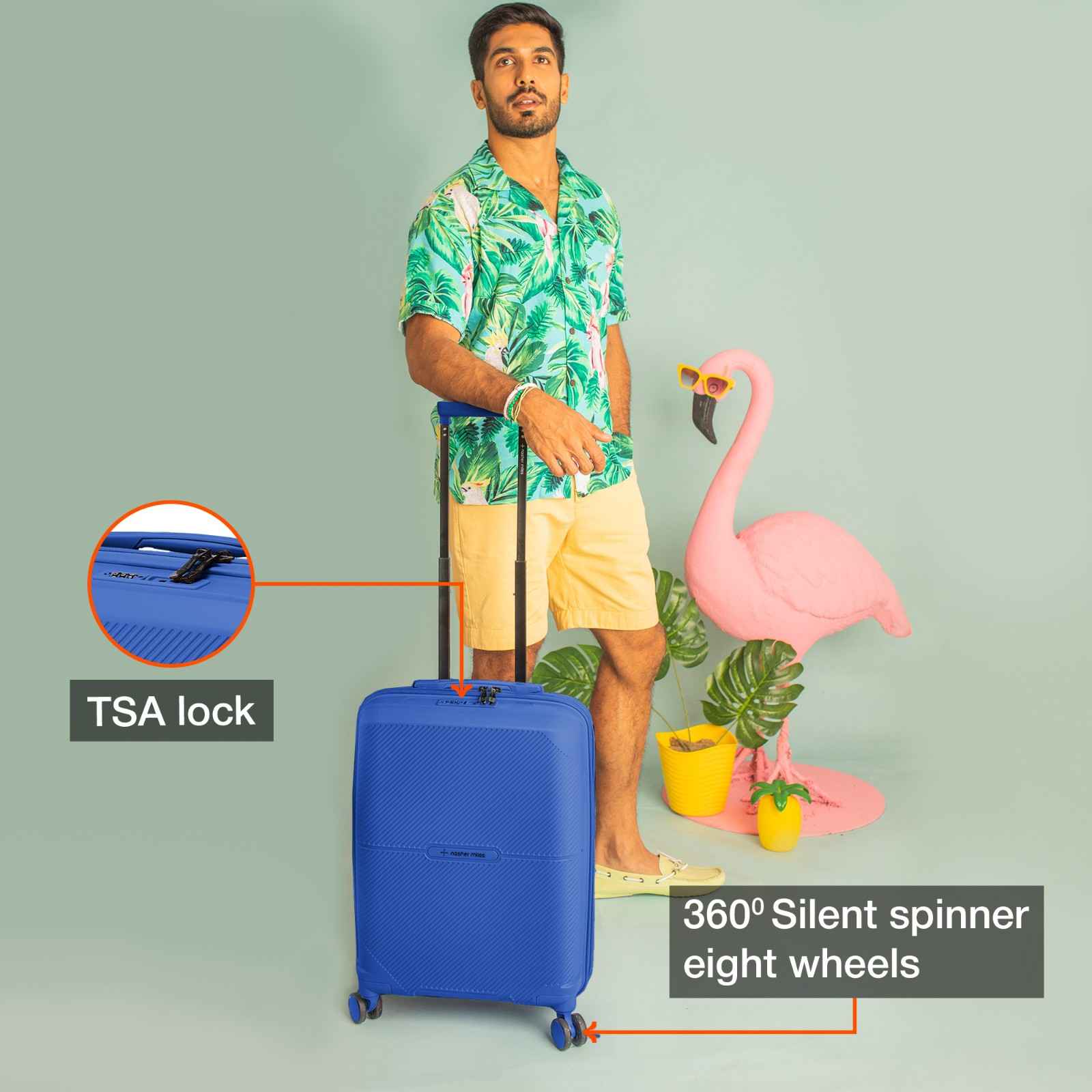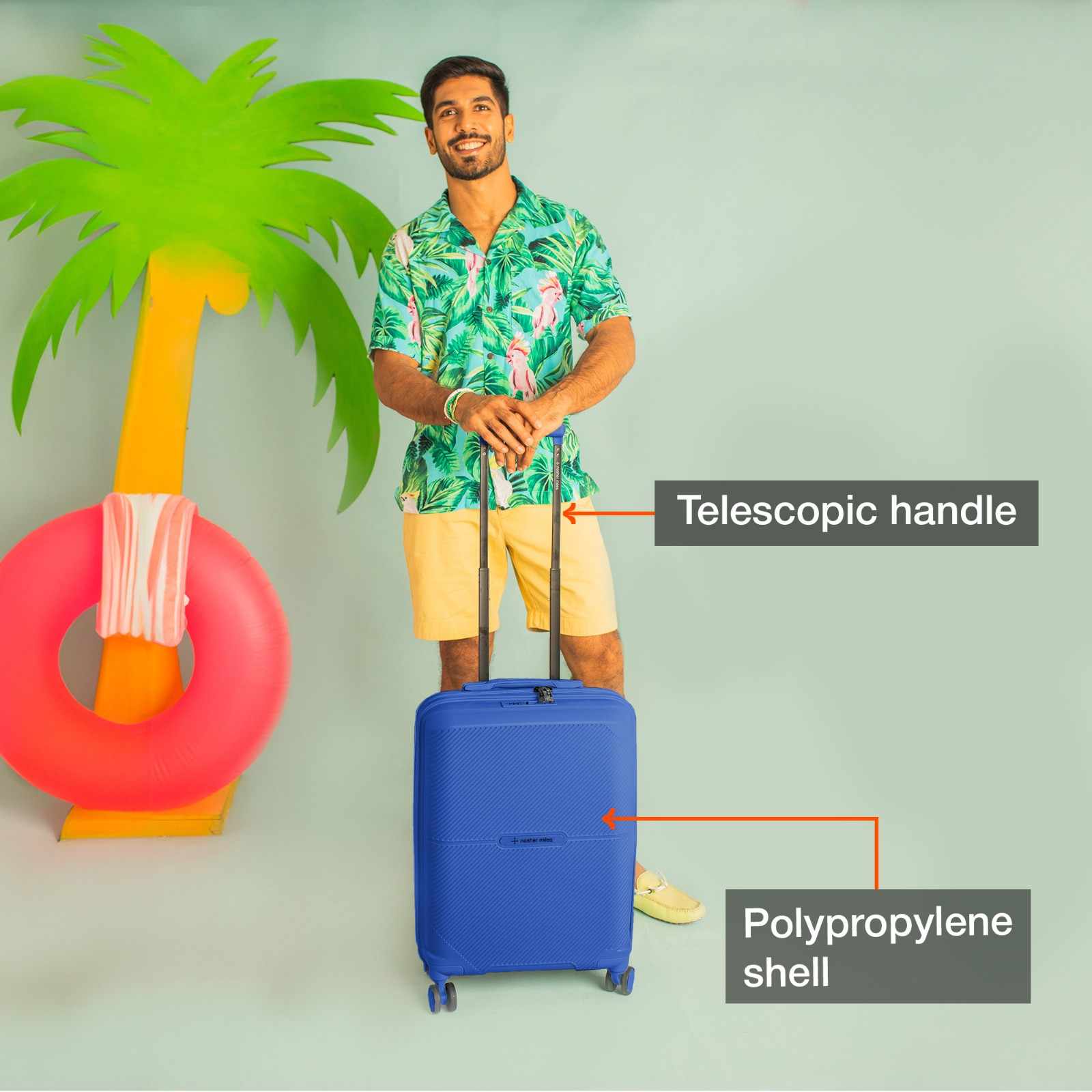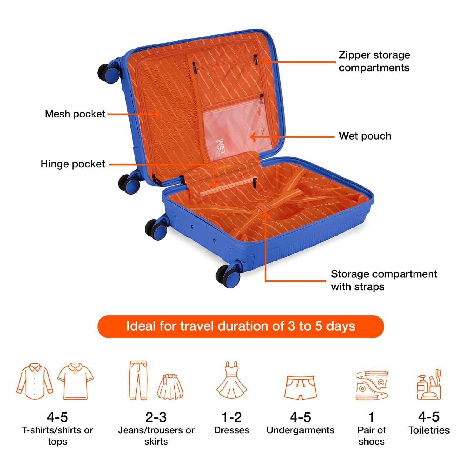 Small (S) Lightweight Hard-Side Cabin Luggage (55cm/20 inches): Travel with our cabin-sized luggage crafted from unbreakable polypropylene material, offering long-lasting durability and protection for your belongings. This compact luggage is designed to carry up to 15 kg of weight and can accommodate materials for a short trip of 2-3 days.