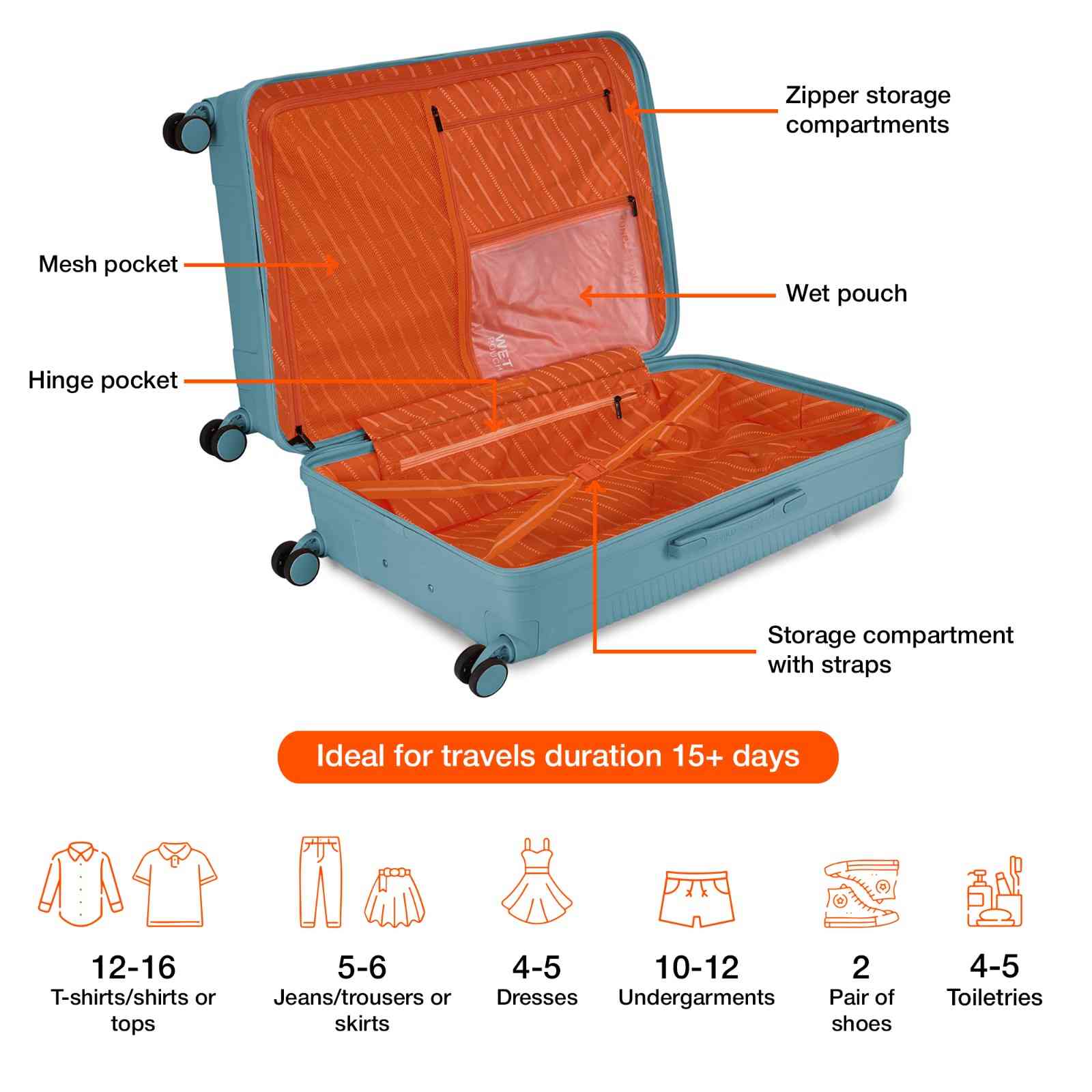 Organized Interior with Wet Pouch: Crafted for convenience, the interior features two main compartments—one with a zippered divider and the other with elastic straps.Additionally, there are one mesh pocket, a hinge pocket, and a wet pouch for wet clothes or toiletries prone to spillage.