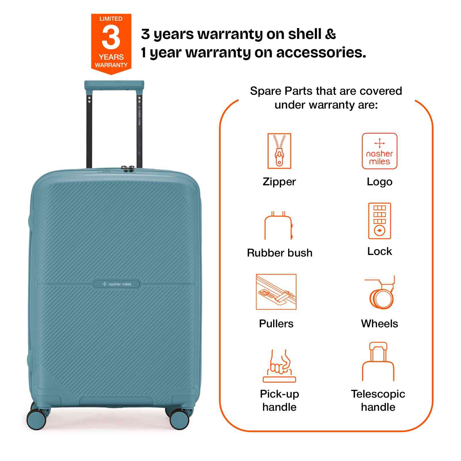 Warranty: 3 Years warranty on shell & 1 year warranty on accessories. Wear & Tear for product under use and scratches are not covered.