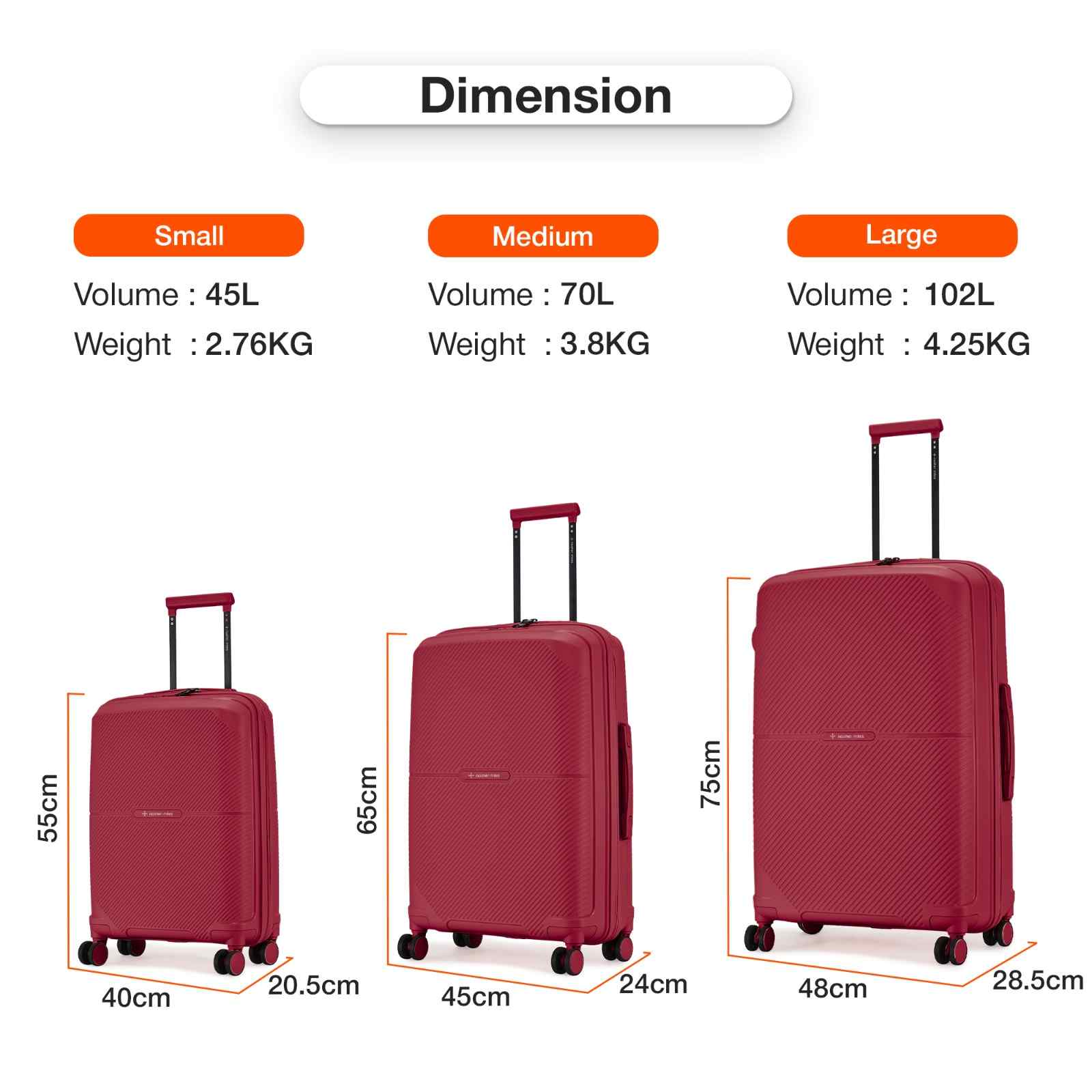 Medium Lightweight Hard-Side Check-In Luggage (65cm/24 inches): Experience the perfect balance of space and convenience with our medium-sized check-in luggage. Made from sturdy polypropylene, this durable bag offers plenty of room and dependable protection for your travel gear. Ideal for extended trips or business travel, it can carry up to 20 kg and has ample space for a week’s worth of items or more.
