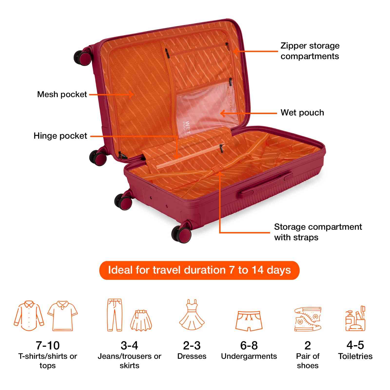 Organized Interior with Wet Pouch: Crafted for convenience, the interior features two main compartments—one with a zippered divider and the other with elastic straps. Additionally, there are one mesh pocket, a hinge pocket, and a wet pouch for wet clothes or toiletries prone to spillage.