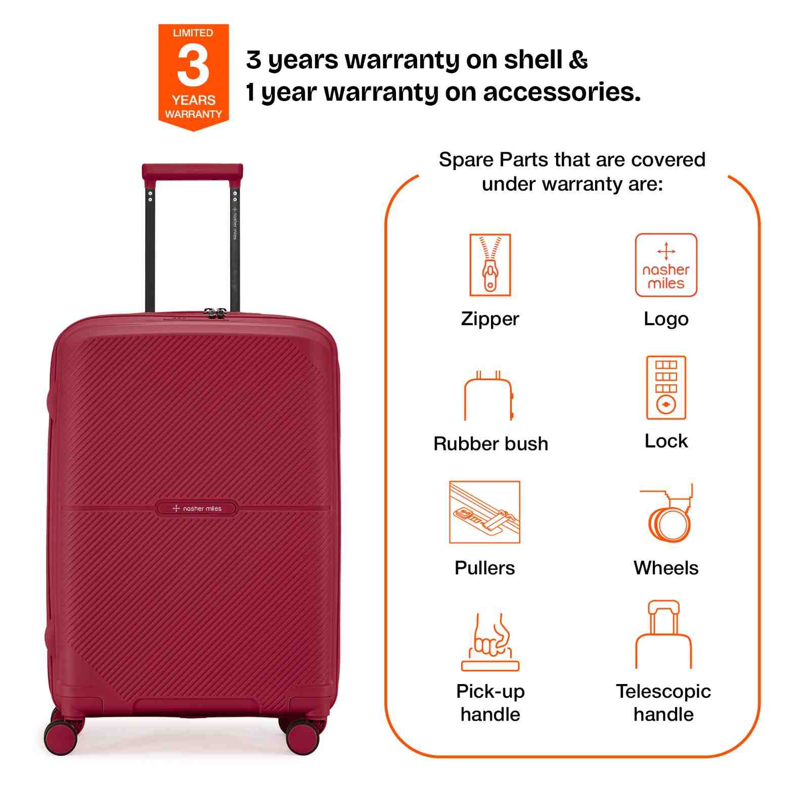 Warranty: 3 Years warranty on shell & 1 year warranty on accessories. Wear & Tear for product under use and scratches are not covered.