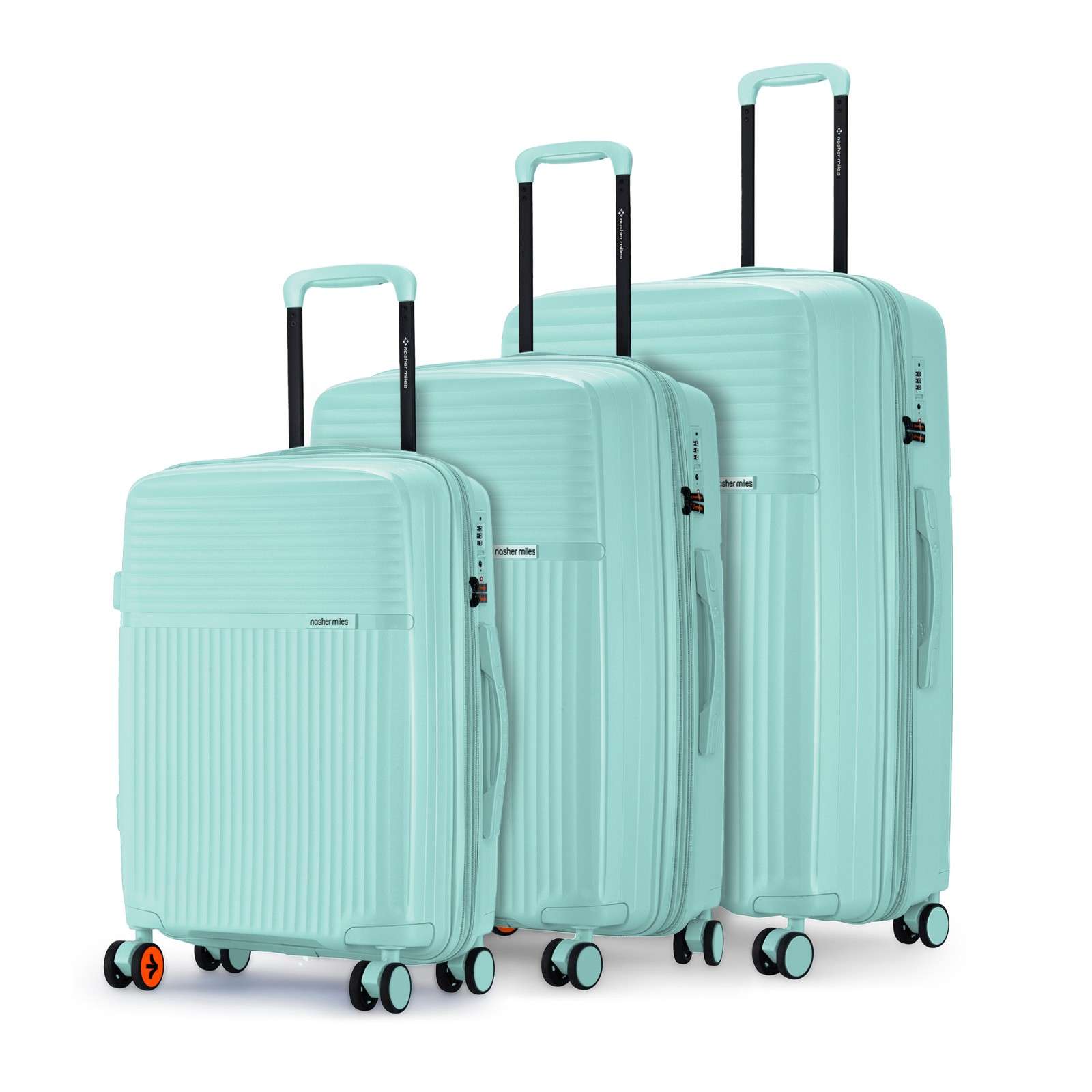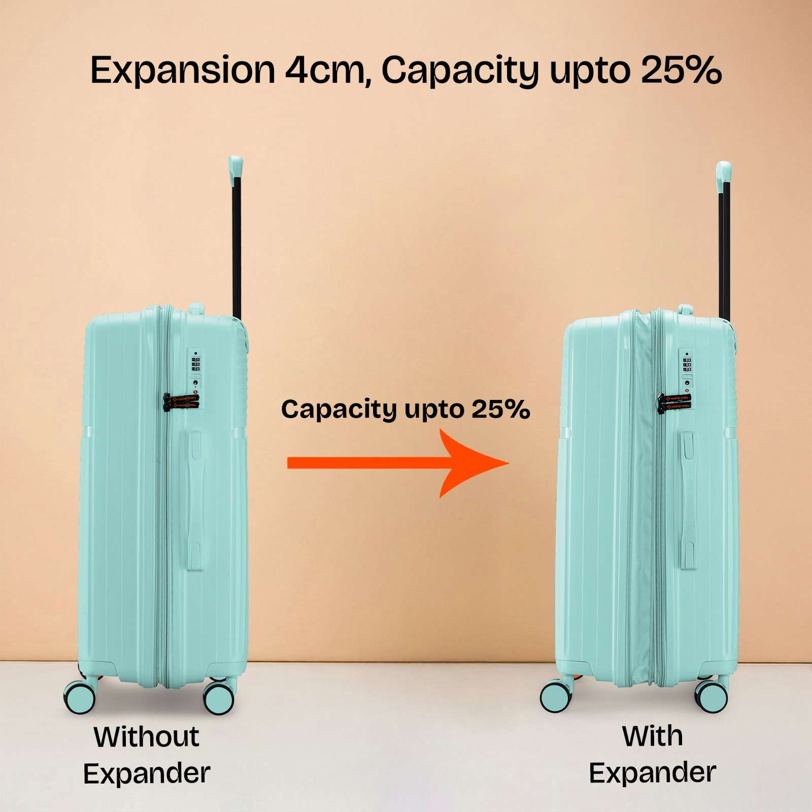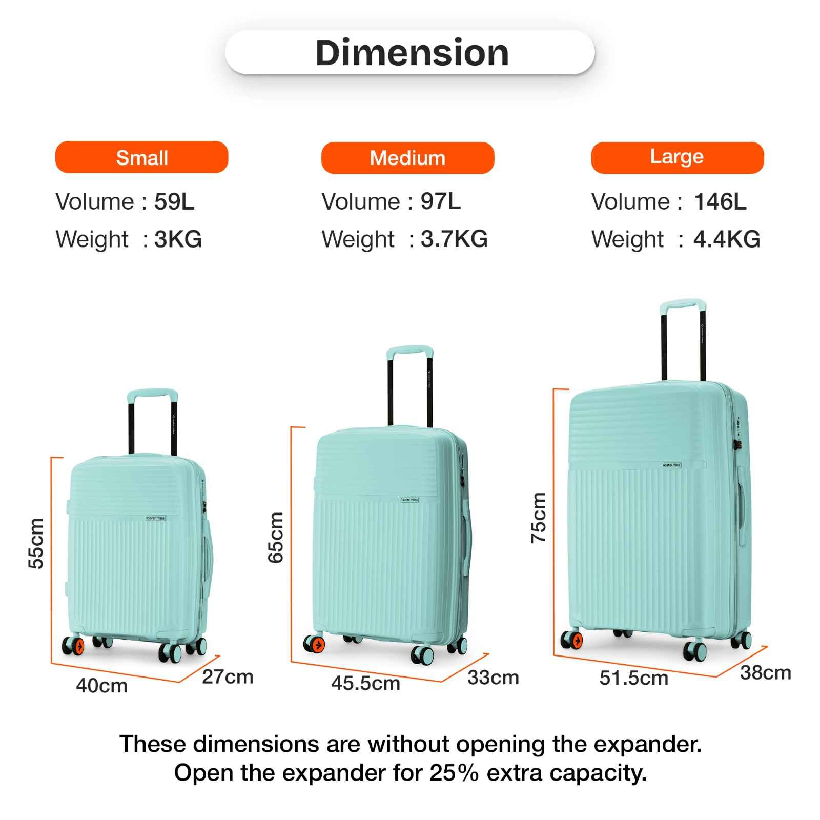 Lightweight Hard-Side 3-Piece Luggage Set: This versatile set includes small (55 cm), medium (65 cm), and large (75 cm) sizes, all crafted from unbreakable polypropylene for exceptional protection during your travels. The small cabin luggage is designed to carry up to 15 kg of weight and the medium-sized luggage can carry