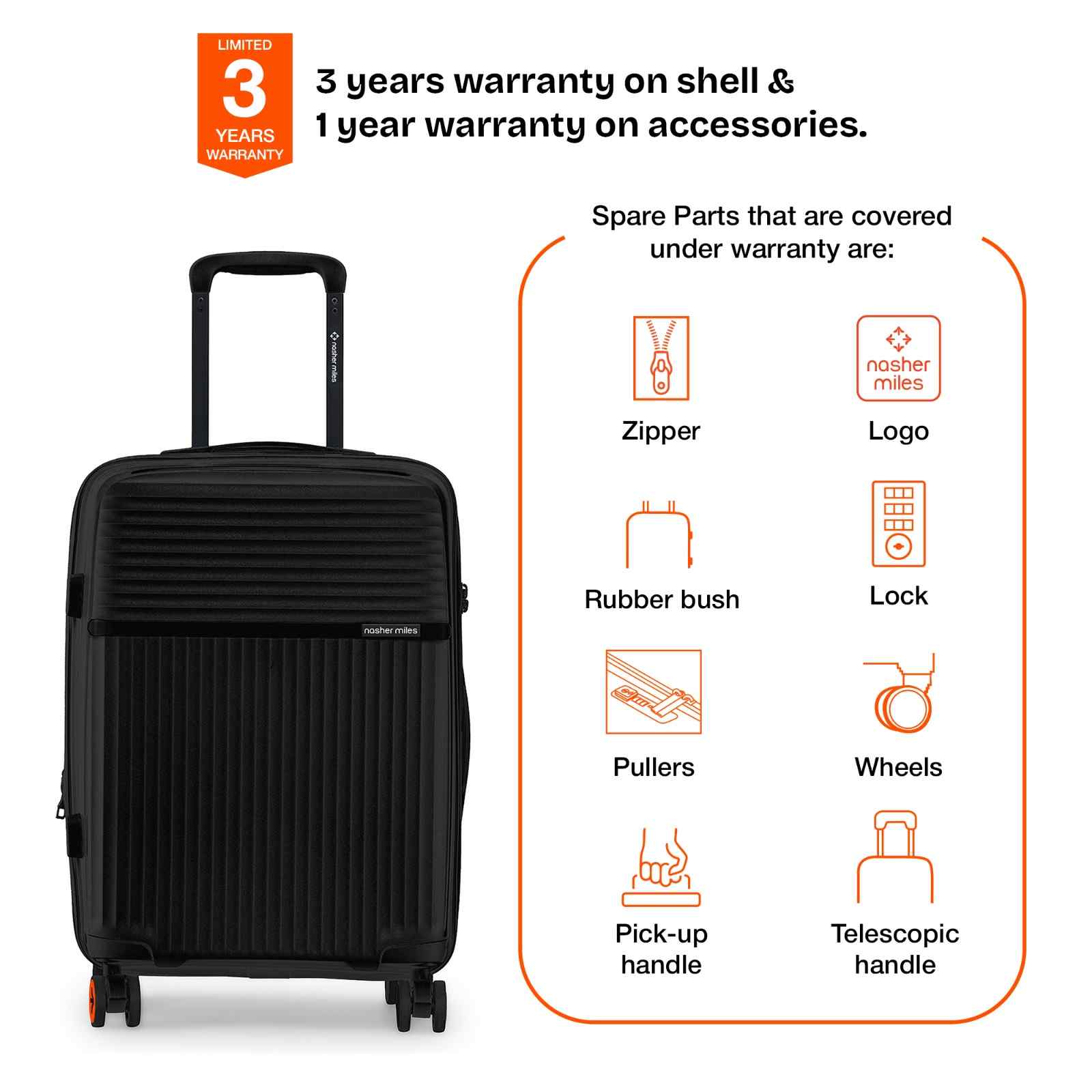 Warranty: 3 Years warranty on shell & 1 year warranty on accessories. Wear & Tear for product under use and scratches are not covered.