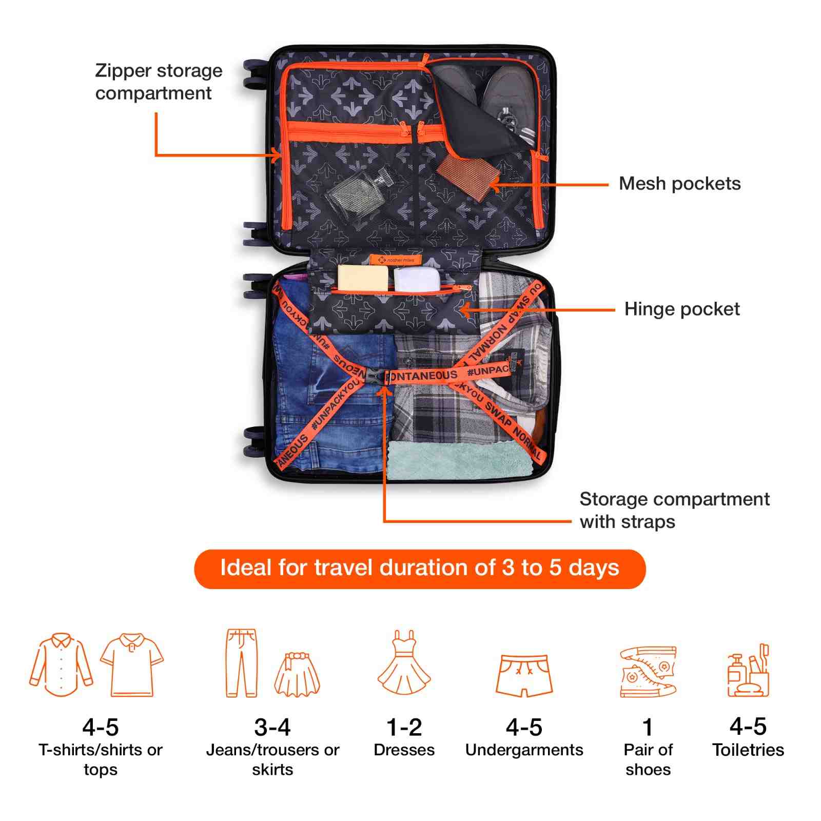 Expandable Design & Organized Packing: Enjoy the flexibility of an expandable design, allowing you to adjust the luggage's capacity to accommodate extra items when needed, paired with two spacious compartments, allowing you to neatly separate and access your belongings during travel.