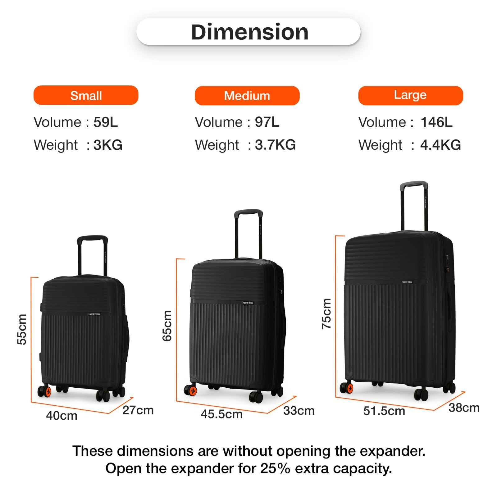Medium Lightweight Hard-Side Check-In Luggage (65cm/24 inches): Achieve the perfect blend of capacity and convenience with our medium-sized check-in luggage. Crafted from unbreakable polypropylene, this durable luggage provides ample space and reliable protection for your travel essentials. Ideal for extended vacations or business travel, this luggage is designed to accommodate up to 20-25 kg of weight and can comfortably hold materials for a week-long trip or longer.