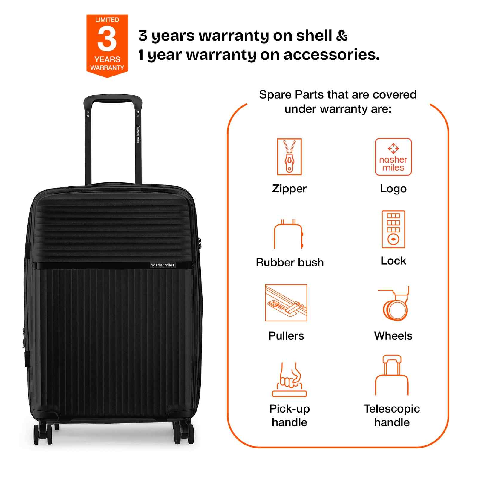 Warranty: 3 Years warranty on shell & 1 year warranty on accessories. Wear & Tear for product under use and scratches are not covered.