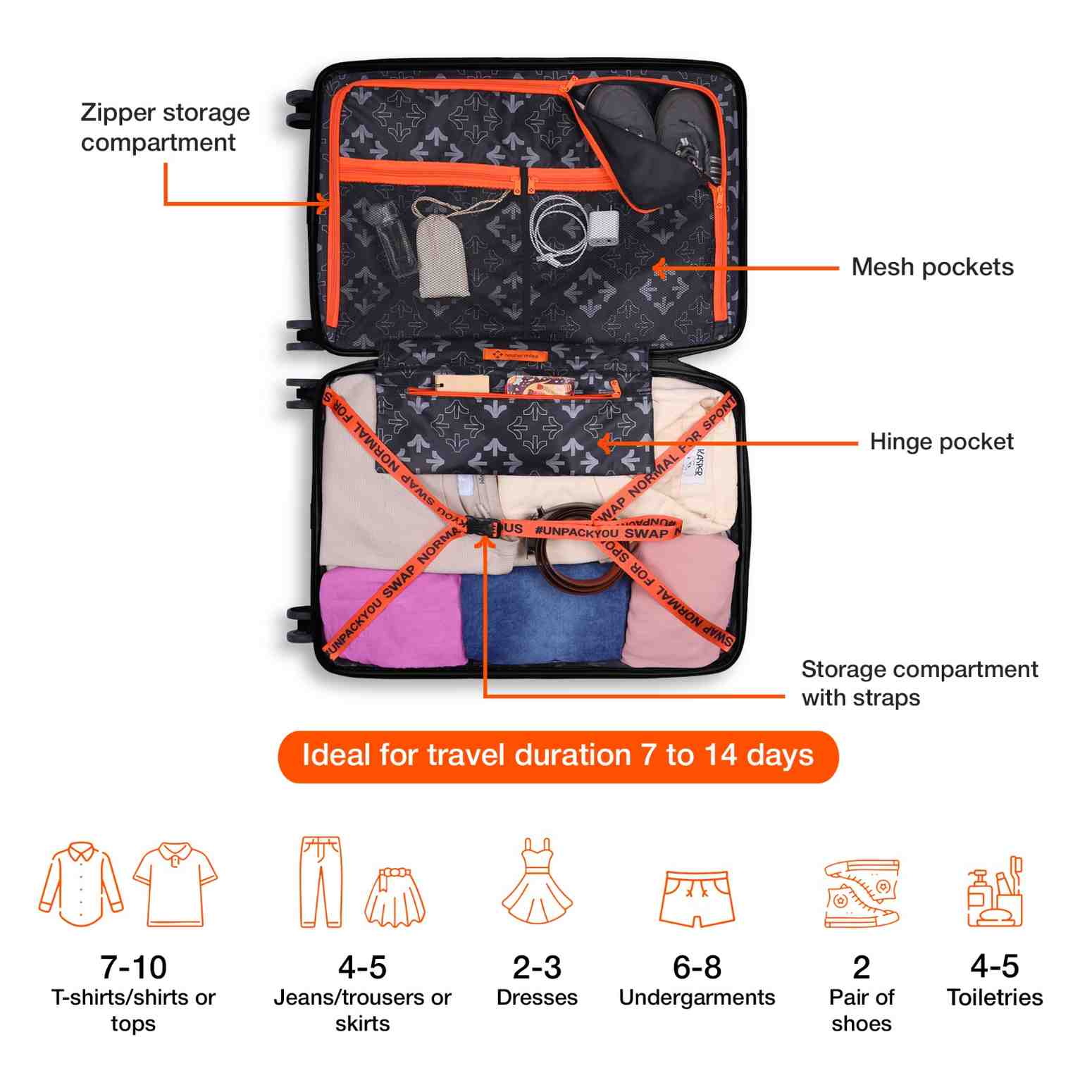 Expandable Design & Organized Packing: Enjoy the flexibility of an expandable design, allowing you to adjust the luggage's capacity to accommodate extra items when needed, paired with two spacious compartments, allowing you to neatly separate and access your belongings during travel.