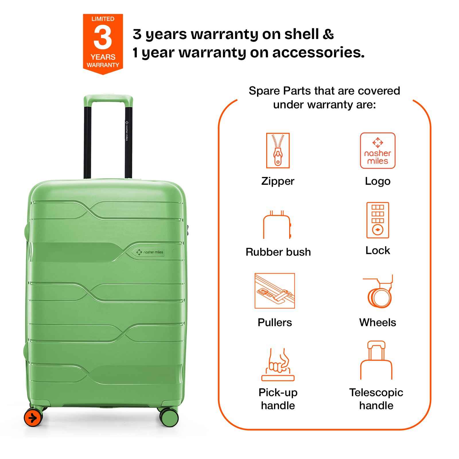Warranty: 3 years warranty on shell & 1 year warranty on accessories. Wear & tear for the product under use and scratches are not covered.