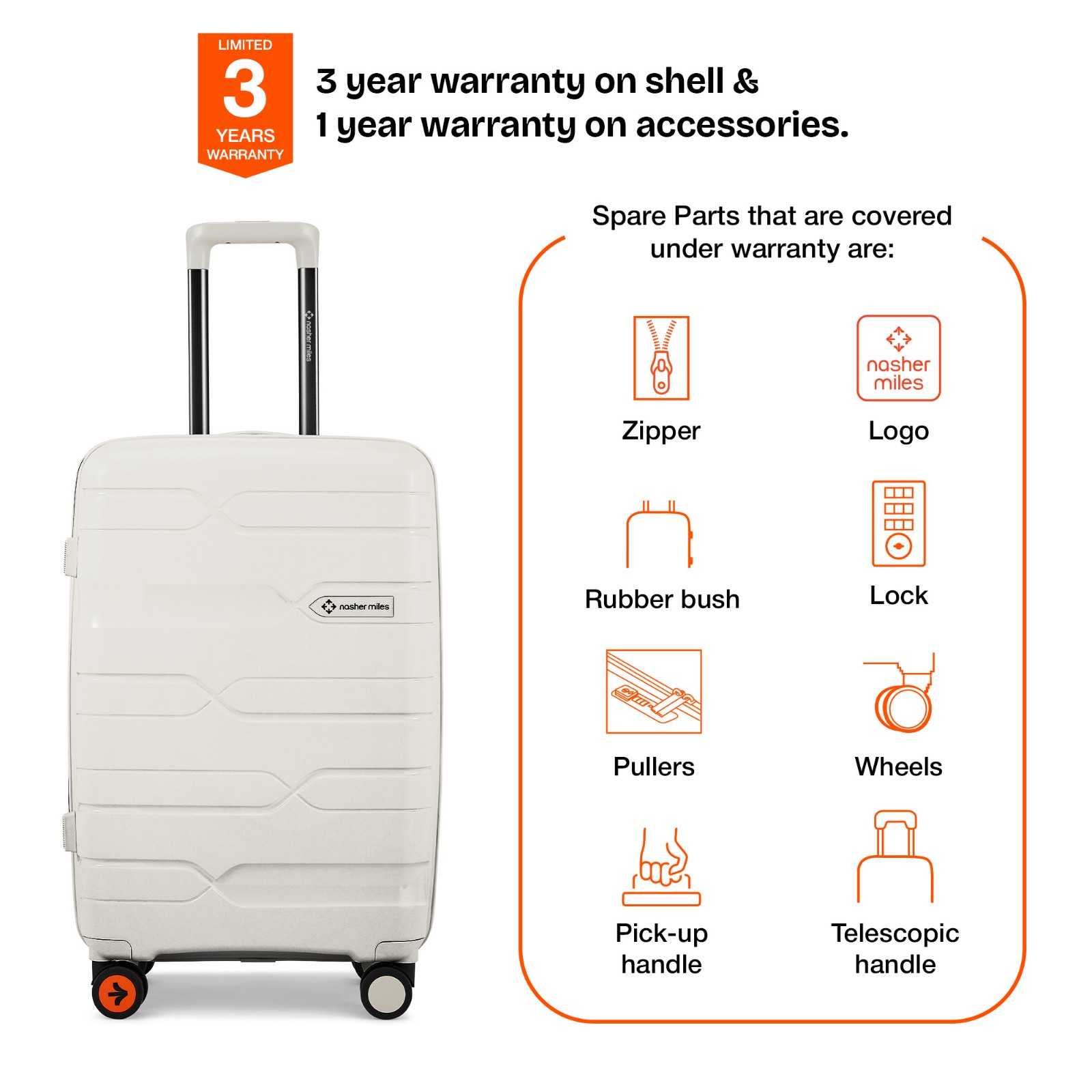Warranty: 3 years warranty on shell & 1 year warranty on accessories. Wear & tear for the product under use and scratches are not covered.