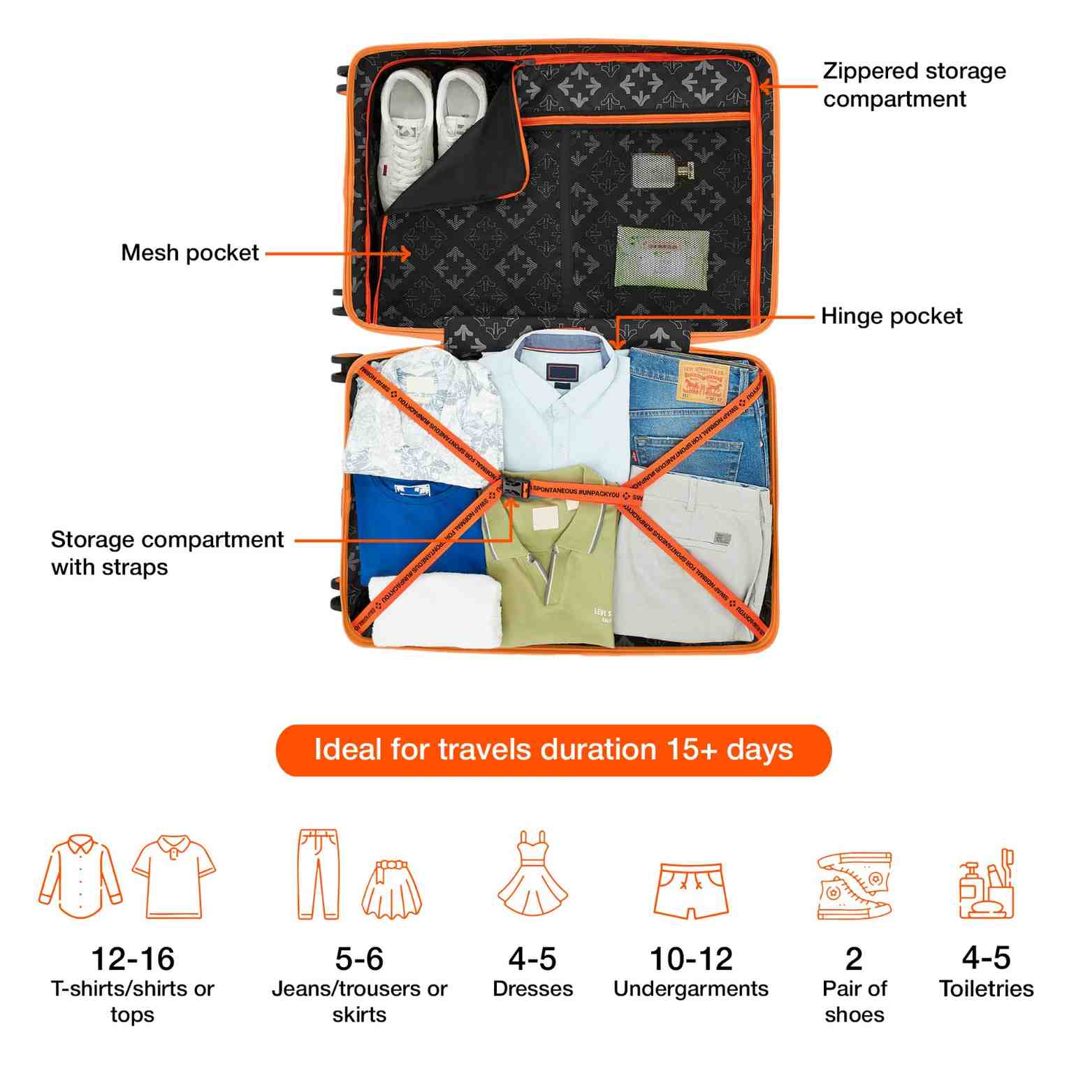 Spacious & Organized Interior: The interior is designed for maximum packing efficiency, featuring multiple compartments and adjustable straps to keep your clothes, accessories, and electronics neatly organized. The mesh pockets provide easy access to small items like toiletries or chargers.