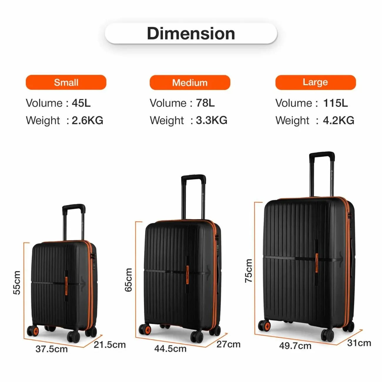 Small (S) Lightweight Hard-Side Cabin Luggage (55cm/20 inches): Travel with our small cabin-sized luggage crafted from unbreakable polypropylene material, offering long-lasting durability and protection for your belongings. This compact yet durable luggage is designed to carry up to 10-15 kg of weight and can accommodate materials for a short trip of 2-3 days.